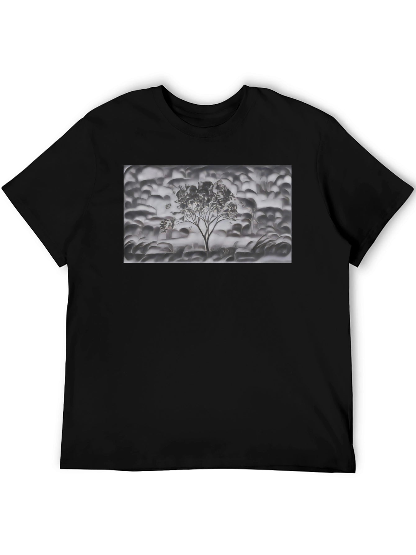 Elevate your wardrobe with this unique monochrome graphic tee. Featuring an intriguing tree design set against an abstract background, this black t-shirt offers a blend of comfort and style. The detailed graphic print creates a visually appealing look that is sure to turn heads. Crafted from soft, breathable fabric, this tee is perfect for everyday wear. Pair it with jeans for a casual outing or dress it up with a blazer for a more polished look. Make a statement with this standout piece. Ideal for art enthusiasts and those who appreciate distinctive designs.