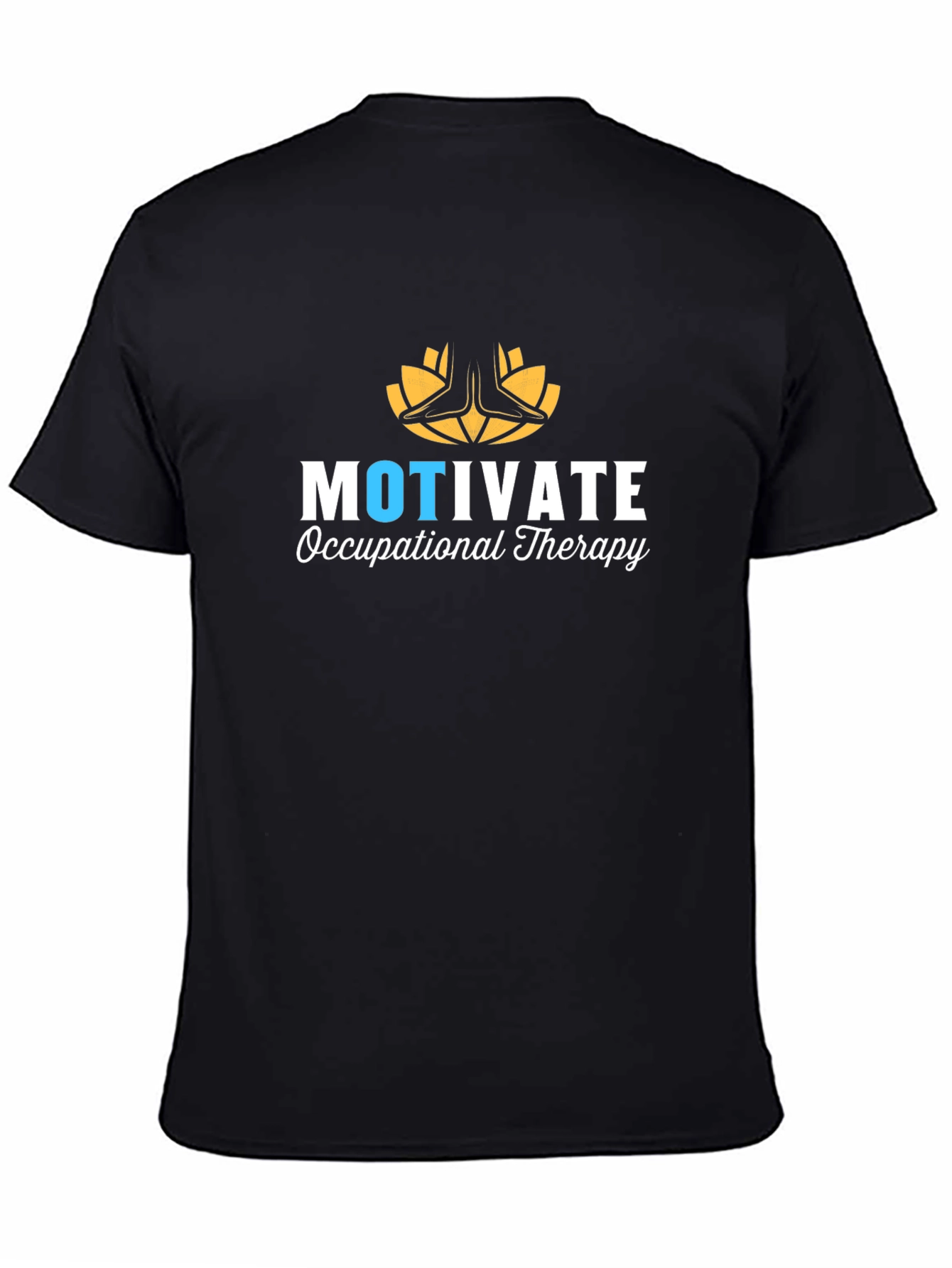 This black t-shirt features a unique design that's perfect for occupational therapists or anyone who wants to inspire and motivate. The graphic includes a stylized lotus flower-like image above the word "MOTIVATE" in white with a blue accent, followed by "Occupational Therapy" in a flowing script font. The shirt appears to be made of a comfortable, breathable material, ideal for everyday wear. Show your passion for occupational therapy and encourage others with this stylish and meaningful t-shirt. It's a great conversation starter and a positive statement piece for work or casual outings.