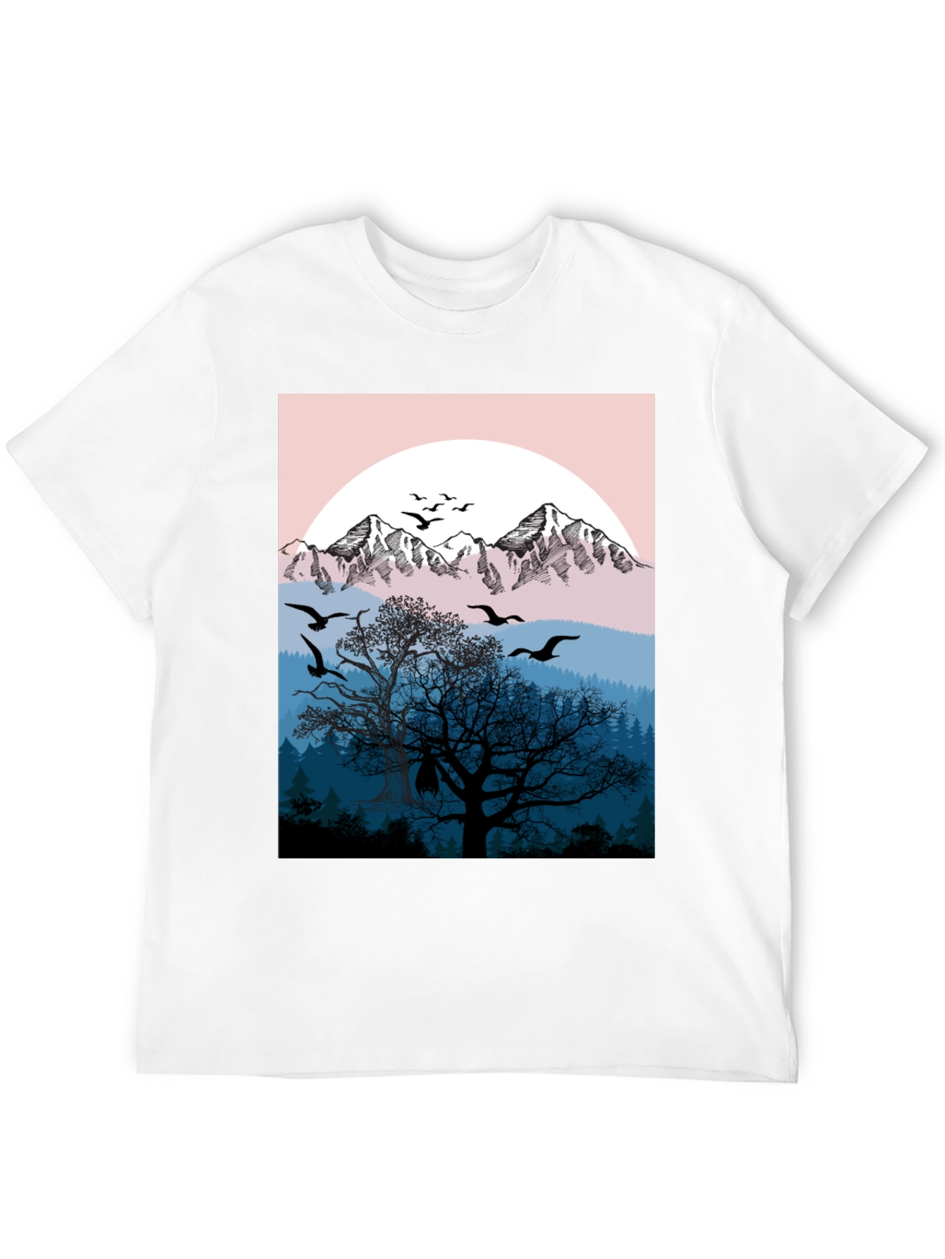 Show off your unique style with this eye-catching black t-shirt! The shirt features a stunning graphic design that includes snow-capped mountains, a serene sunset, silhouetted birds in flight, and a detailed tree. The various shades of blue create a calming, nature-inspired aesthetic. Made from comfortable materials, this tee is perfect for casual wear, outdoor adventures, or expressing your love for nature. The versatile black color ensures it pairs effortlessly with any outfit. Add this standout piece to your wardrobe and elevate your everyday look!