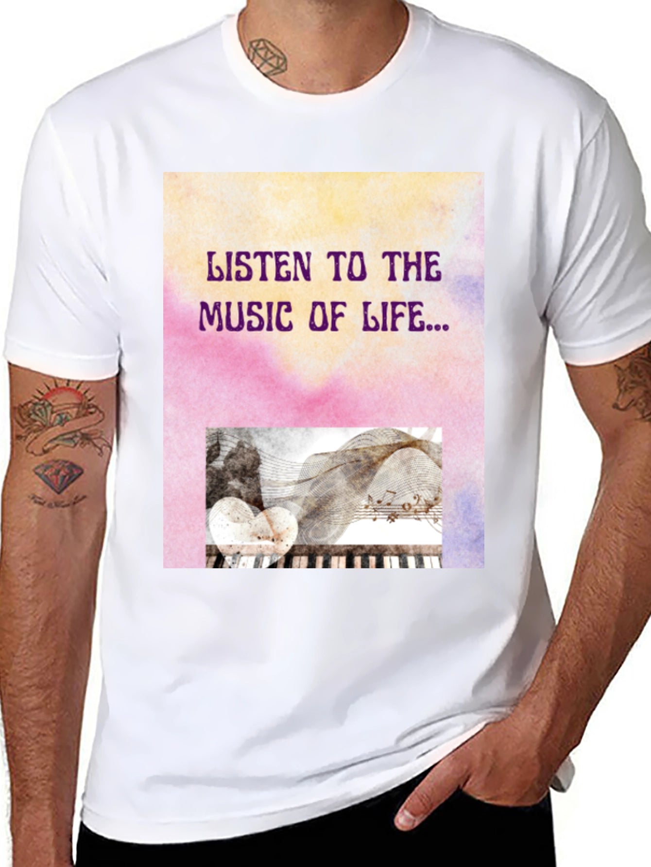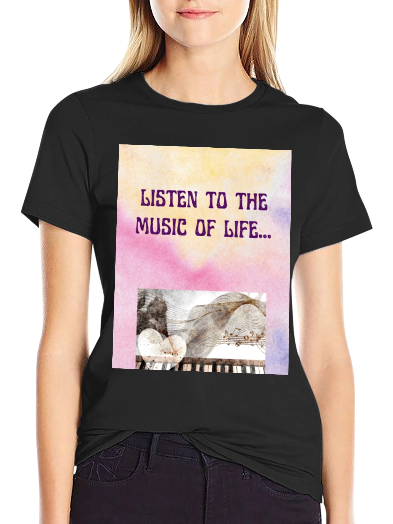 Express your love for music with this unique graphic tee. Made from soft, breathable fabric, this black t-shirt features a vibrant print with the phrase "Listen to the Music of Life..." The design incorporates artistic elements of musical notes, piano keys and hearts, set against a watercolor-style background. This tee offers a comfortable fit for everyday wear. Perfect for music lovers and those who appreciate artistic designs, this t-shirt is sure to make a statement wherever you go. Pair it with jeans or casual shorts for a relaxed and stylish look. It's a great conversation starter and a perfect gift for the musician in your life.