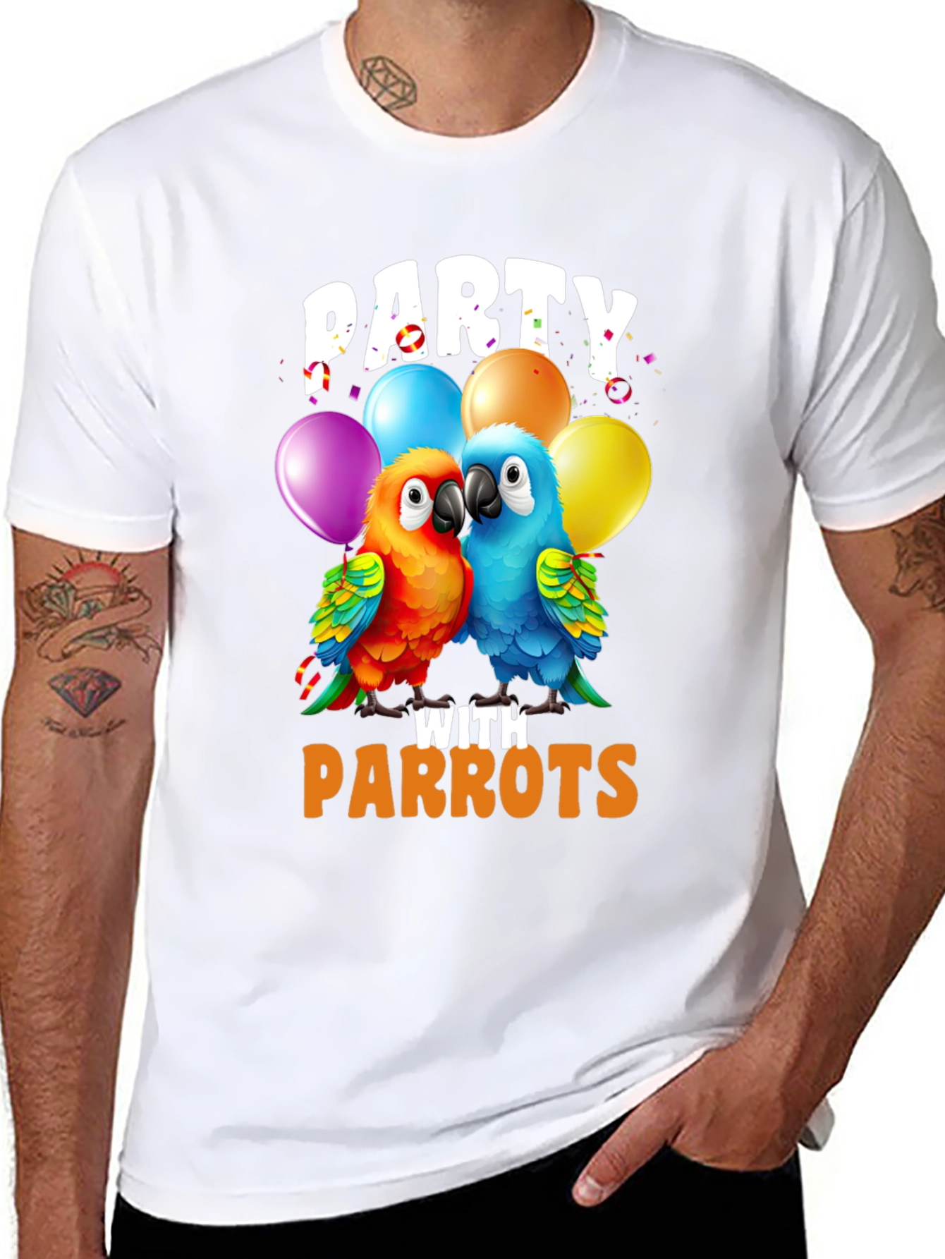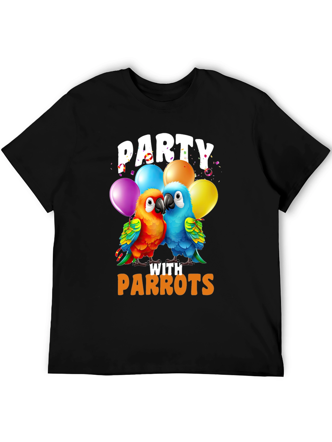 Get ready to party with this fun and festive t-shirt! This eye-catching black tee features a colorful graphic of two parrots amidst vibrant balloons and confetti, with "Party with Parrots" emblazoned in bold lettering. The design is perfect for parrot lovers or anyone looking to add a playful touch to their wardrobe. Made from a comfortable fabric, this shirt is ideal for casual outings, parties, or simply showing off your love for these beautiful birds. The bright colors and cheerful design are sure to turn heads and spark conversations. Get yours today and let the party begin!