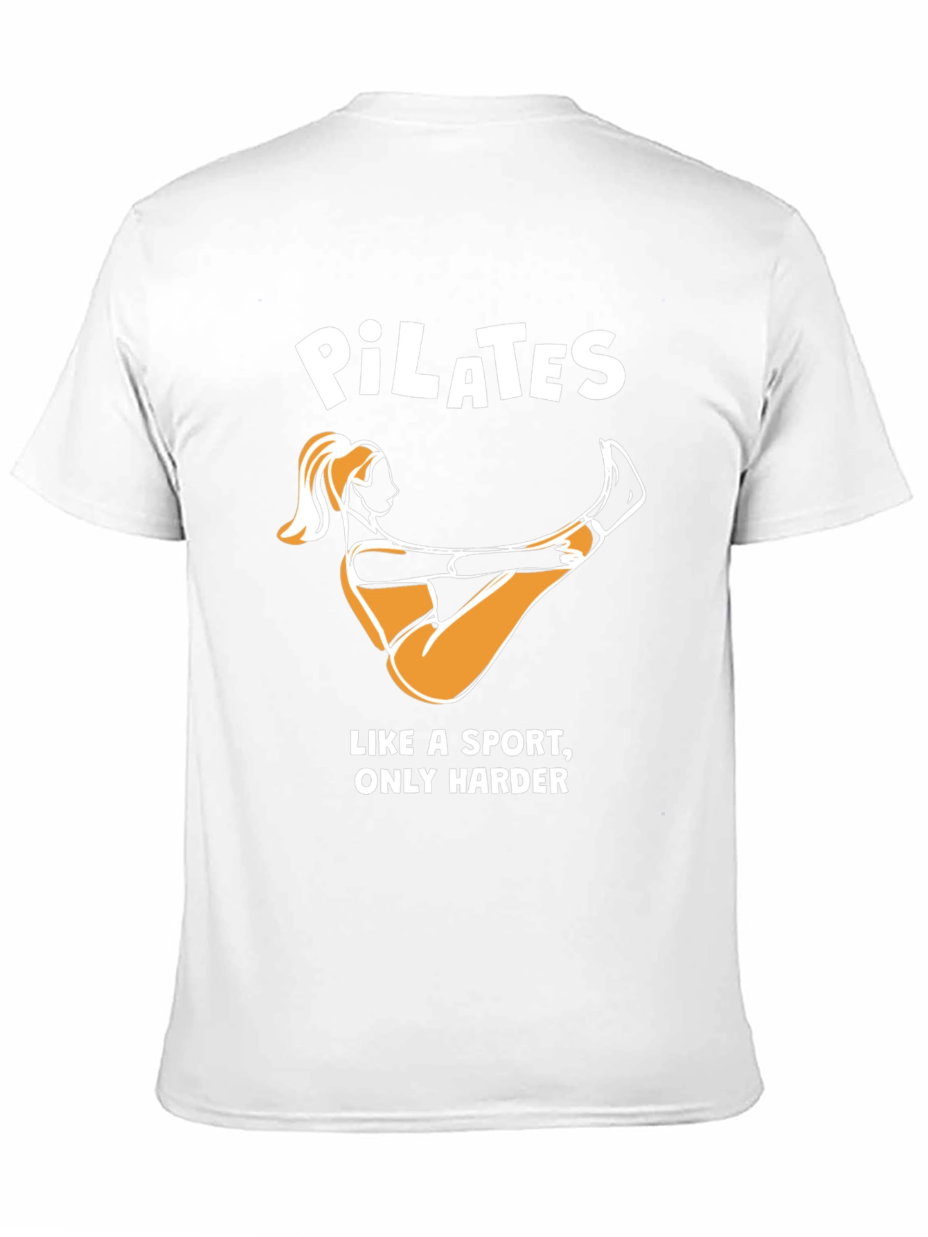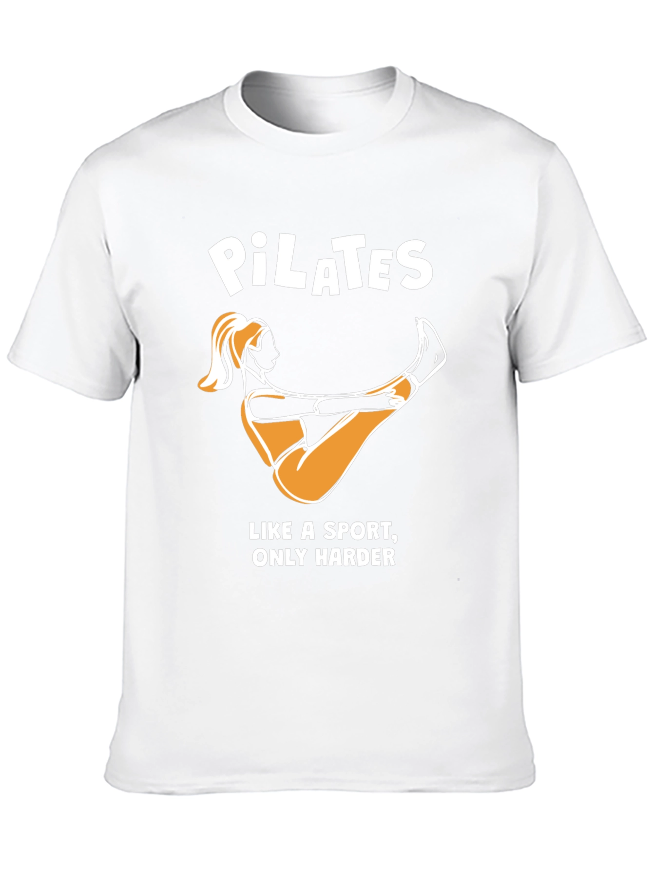 Show off your love for Pilates with this unique and humorous t-shirt. This stylish black tee features a playful design with the word 'PILATES' printed above a graphic of a person doing Pilates, accompanied by the witty phrase 'LIKE A SPORT, ONLY HARDER.' The design is printed in white and light orange and stands out against the shirt's background, creating a bold and eye-catching look. Made from comfortable fabric, this t-shirt is perfect for casual wear, workouts, or as a fun gift for Pilates enthusiasts. Whether you're headed to a class or just want to express your passion, this shirt is sure to turn heads and spark conversations.