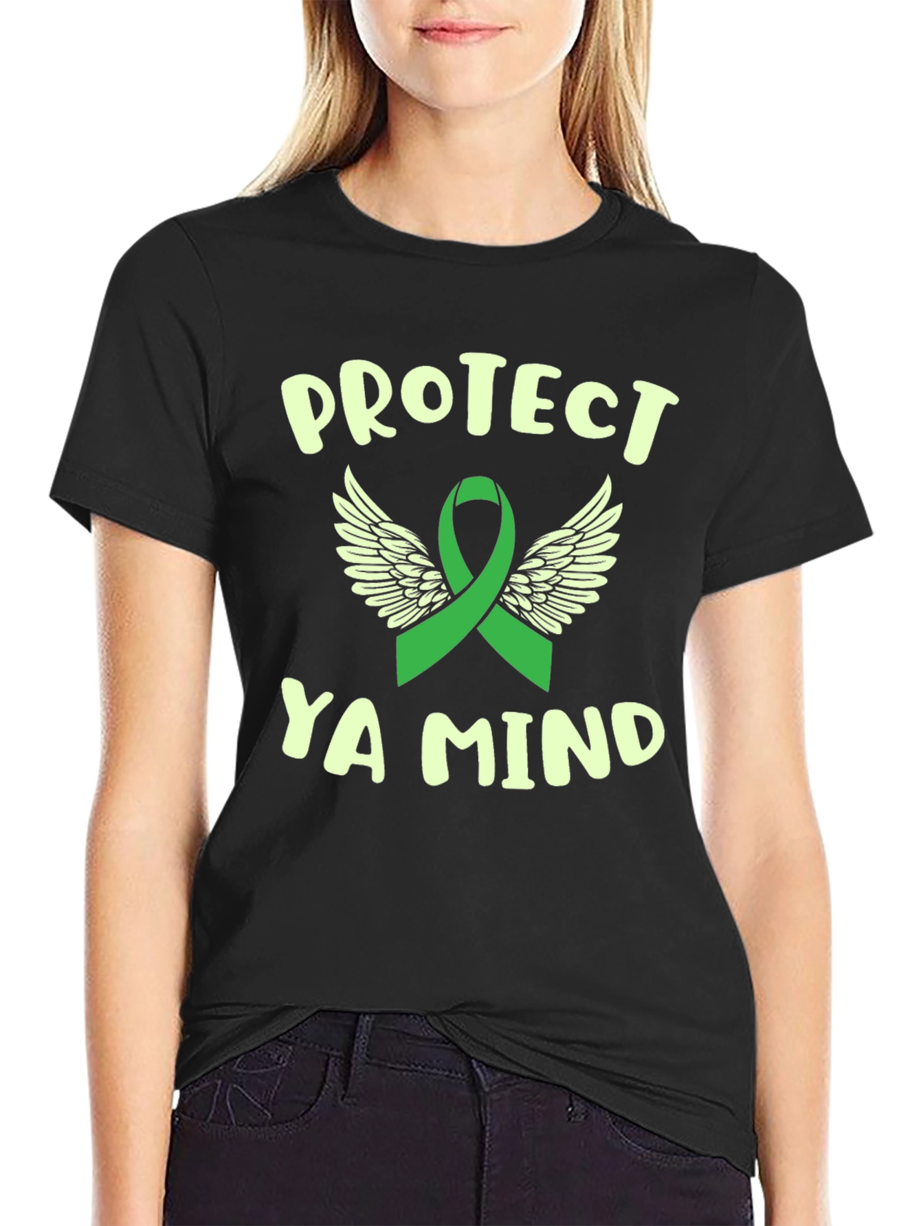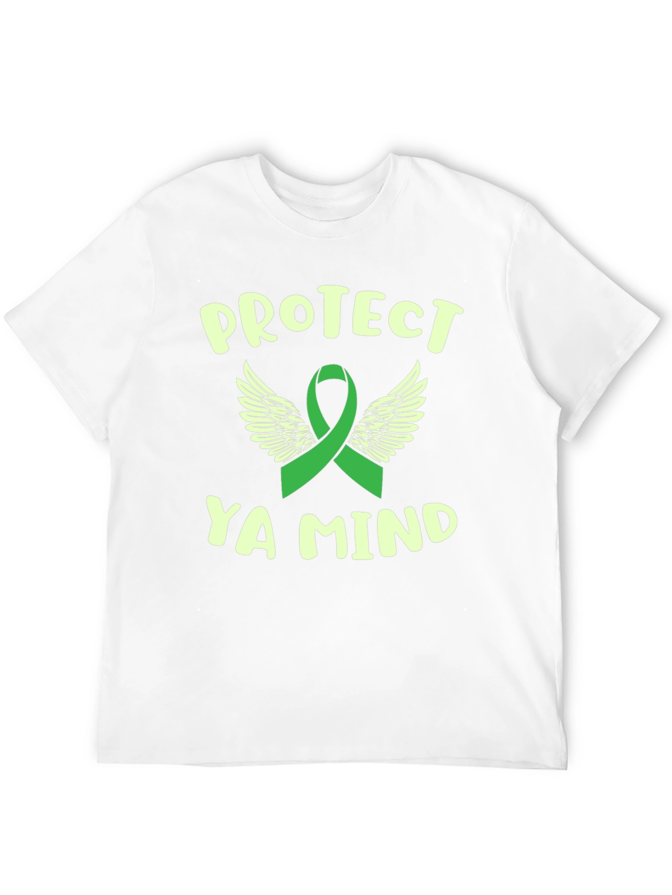 Show support for mental health awareness with this meaningful tee! Featuring a vibrant green ribbon, symbolizing awareness, adorned with angelic wings, representing hope and protection. Bold text reads "PROTECT YA MIND", serving as a reminder to prioritize well-being. Crafted from soft, comfortable fabric, this tee is perfect for everyday wear, walks, or any activity where you want to spread awareness. This is a powerful statement of support and advocacy for mental health and those who promote it.