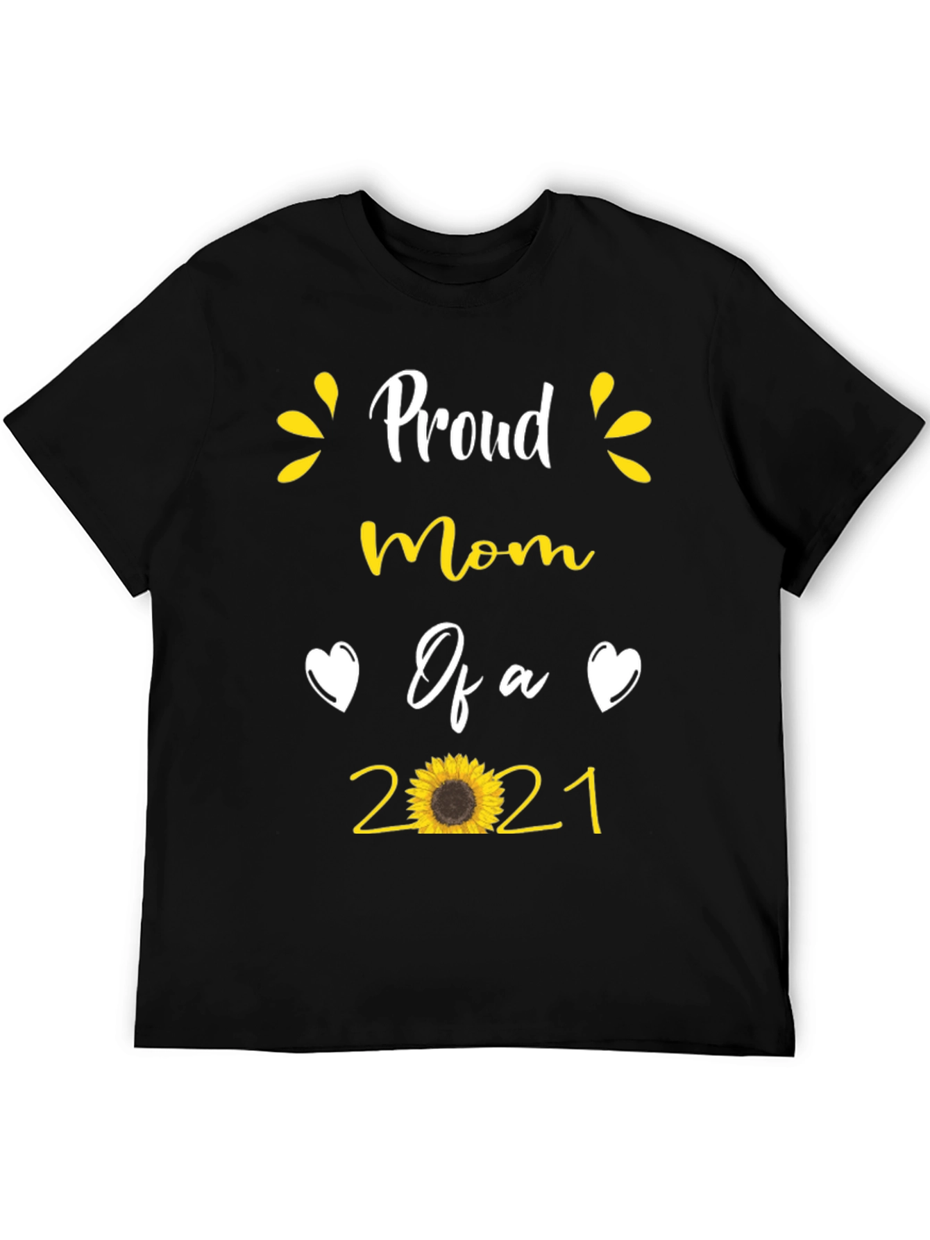 Show your pride with this stylish "Proud Mom of a 2021" t-shirt. Featuring a bold design with playful fonts and sunflower accents, this shirt is perfect for any proud mother. The shirt is black with yellow and white detailing. It is made from comfortable materials, ideal for everyday wear. The cute hearts and sunflower replace the number zero in the 2021 to add a sweet touch. Makes a thoughtful gift or a great way to celebrate your child's special year. Wear it to school events, family gatherings, or just around town to spread the love!