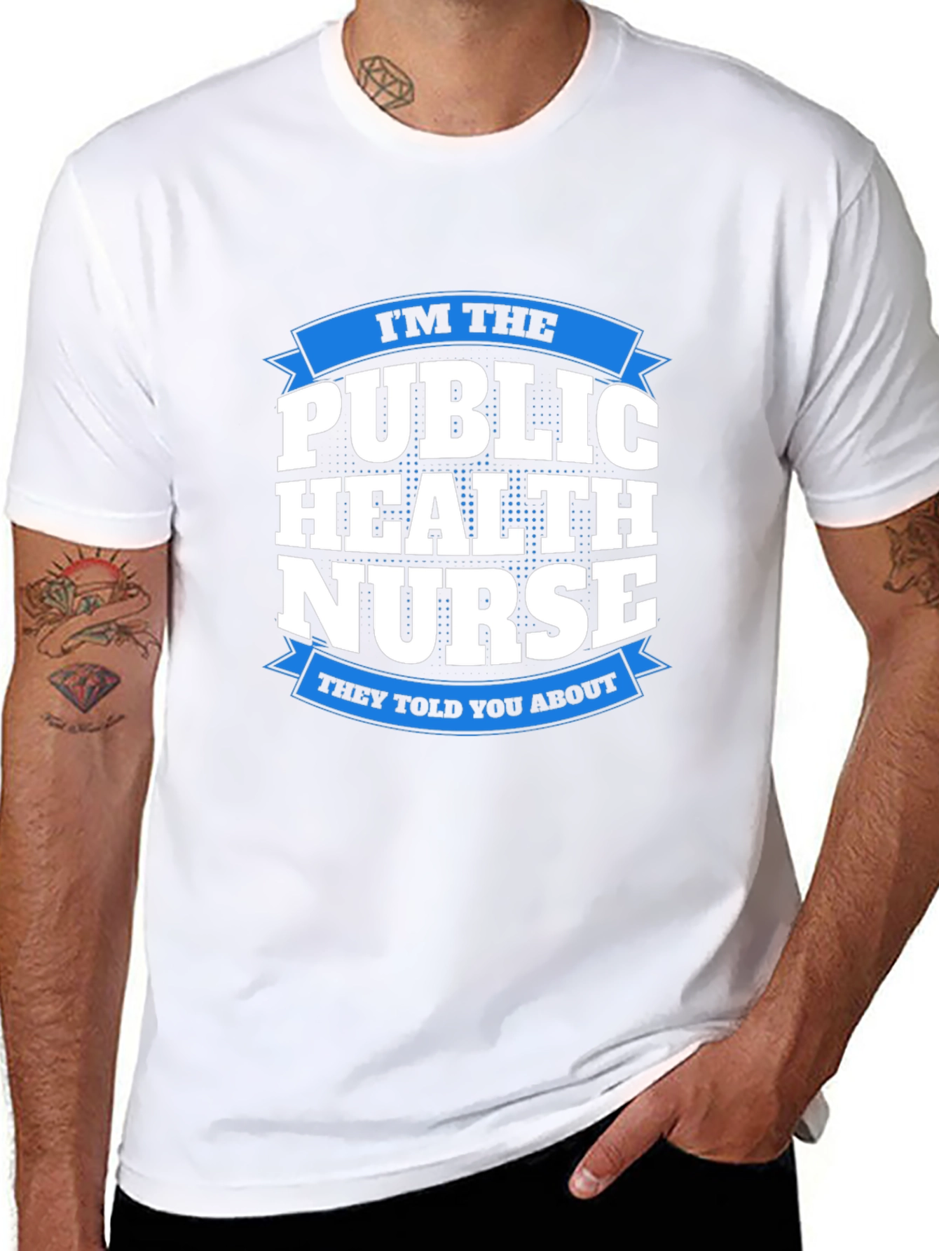 Show off your dedication to public health with this bold graphic tee. Featuring a striking design that reads "I'm the Public Health Nurse they told you about" emblazoned across the chest in a crisp, clean font. The eye-catching blue ribbon accents add a touch of style to this comfortable and durable t-shirt. Made from soft, breathable fabric, this tee is perfect for everyday wear, whether you're at work, running errands, or just relaxing at home. Its classic fit ensures a comfortable and flattering look for both men and women. Makes a great gift for the hard-working public health nurse in your life!