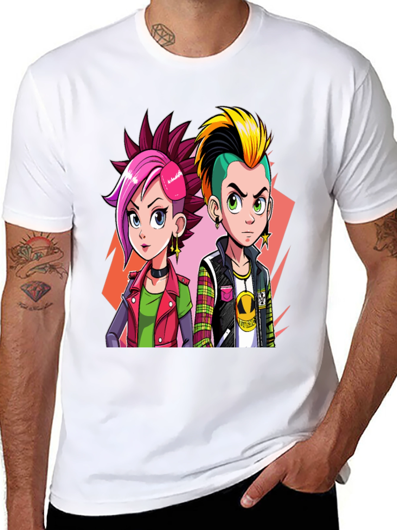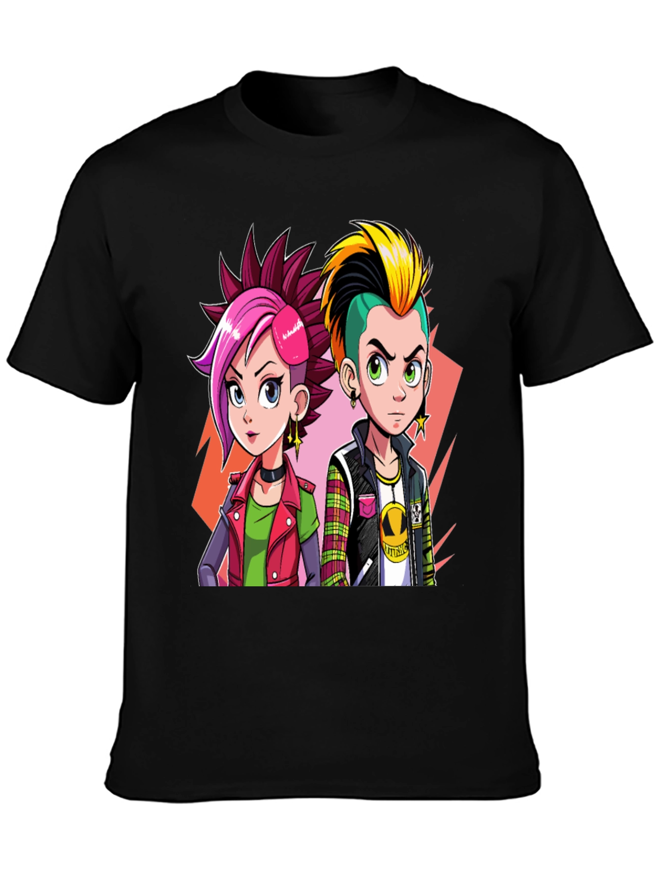 Rock an edgy, alternative vibe with this unique cartoon graphic tee. The design showcases two stylish punk characters with vibrant, spiky hair and cool attire. Made from comfortable material, this black tee features a standout print that adds a rebellious touch to any outfit. Perfect for casual wear, concerts, or expressing your individuality. Pair it with jeans and boots for a complete look. Get ready to turn heads and make a statement with this standout t-shirt!