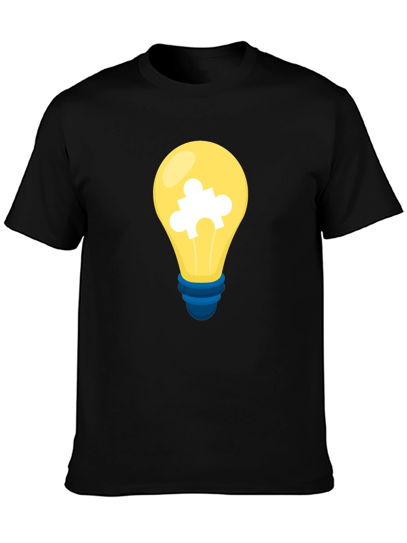 This black t-shirt features a vibrant and eye-catching graphic of a lightbulb containing a white puzzle piece, symbolizing creativity and problem-solving. The design stands out against the classic black backdrop, making it a versatile piece for casual wear. Made from a soft, breathable fabric, this tee offers both style and comfort. The short sleeves and relaxed fit make it perfect for everyday wear, whether you're running errands or meeting friends. Showcase your unique style and intellect with this conversation-starting tee.