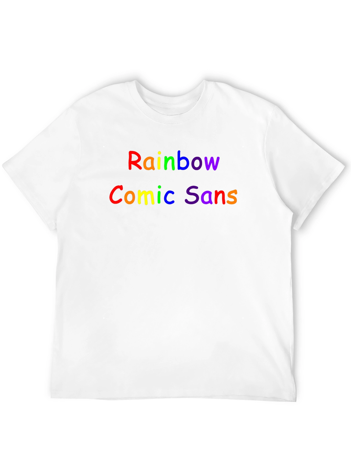 Show your love for graphic design with this black t-shirt featuring the words "Rainbow Comic Sans" in vibrant, rainbow colors. Made from a soft, comfortable fabric, this classic fit tee is perfect for casual wear. The playful design adds a pop of fun to any outfit. Ideal for everyday wear, parties, or showing off your unique style. This eye-catching shirt is sure to turn heads and spark conversations. Get yours today and make a bold statement!