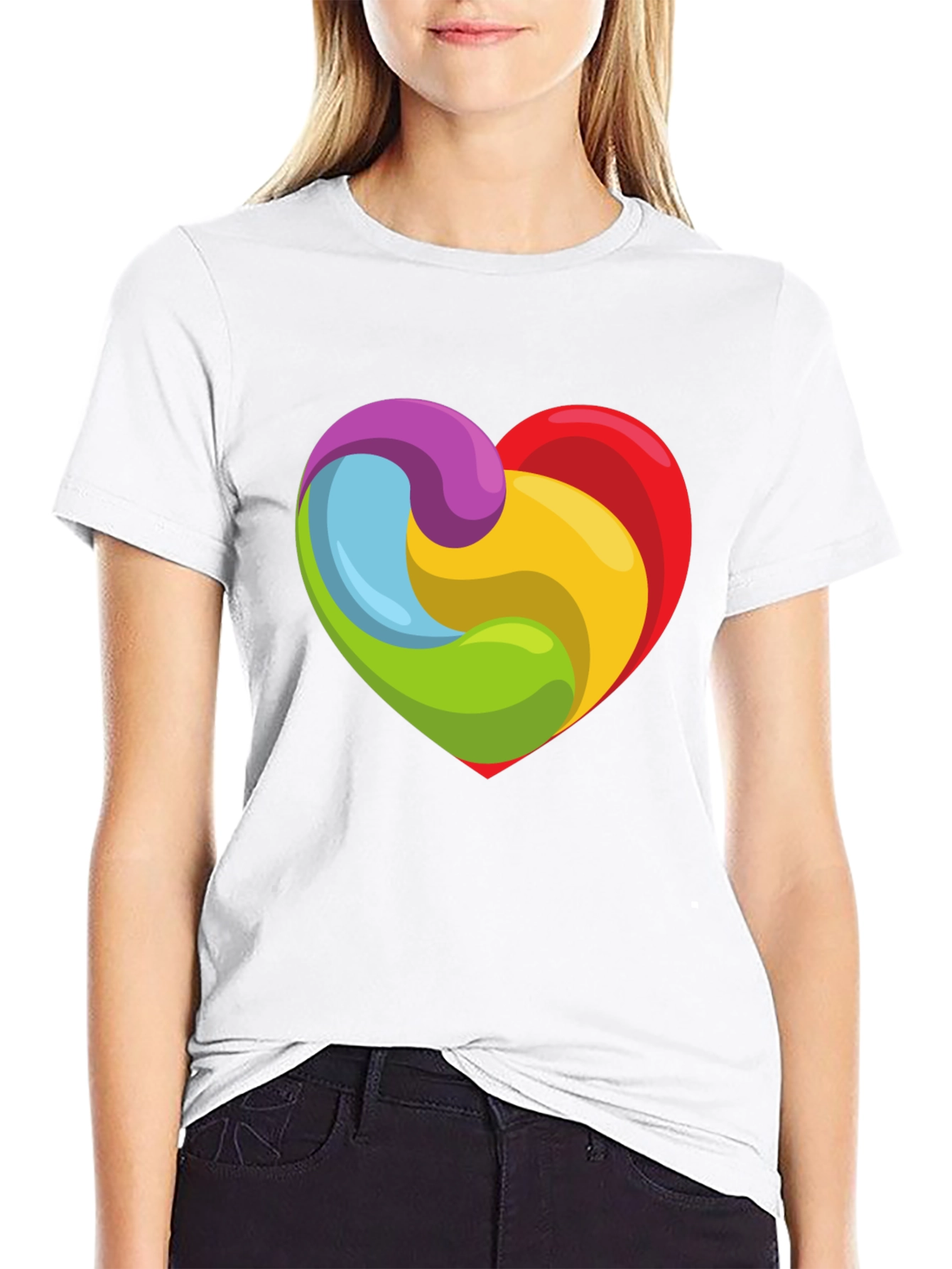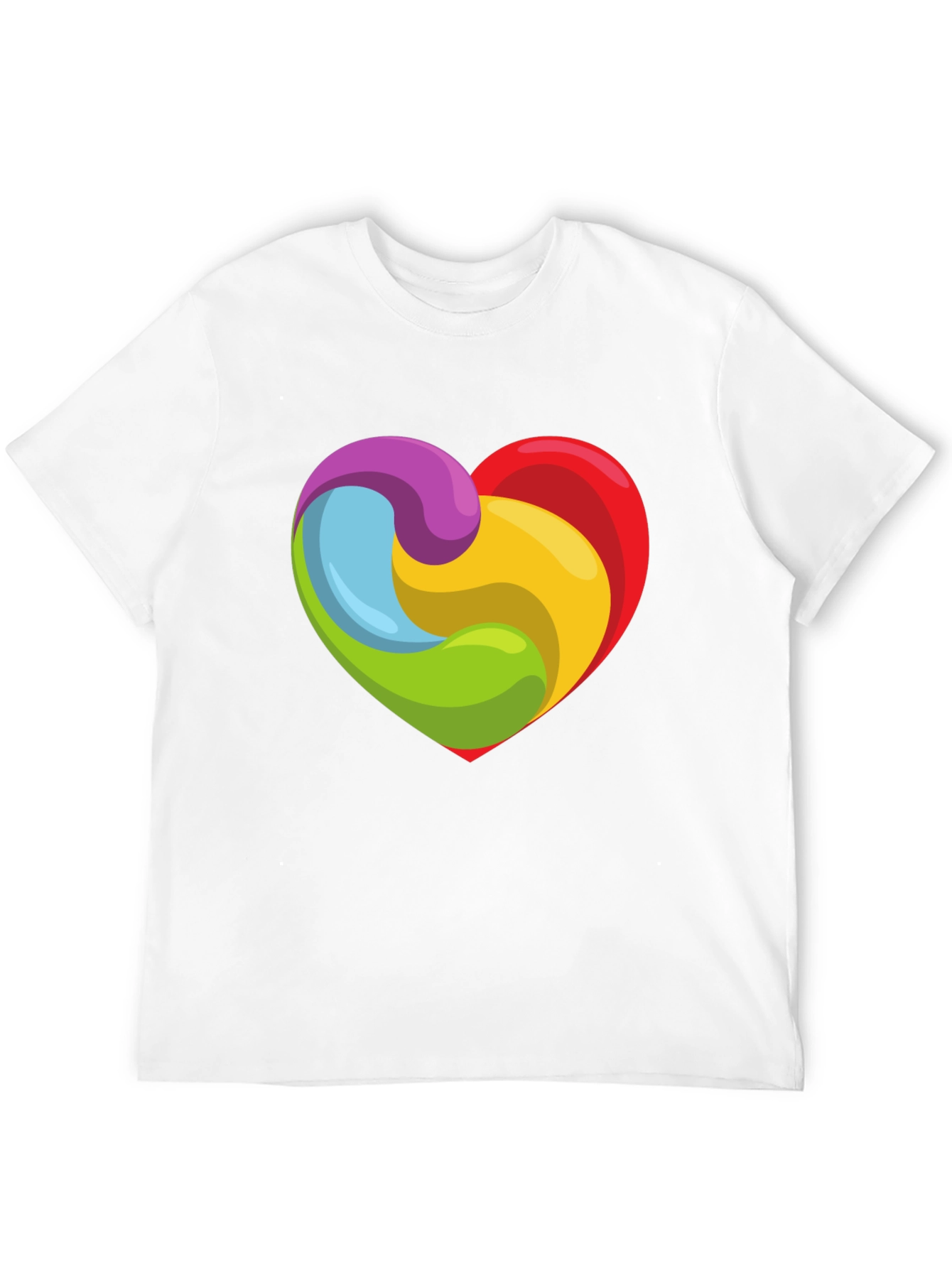 Show your love with this vibrant and eye-catching black t-shirt! This tee features a unique heart design made of swirling rainbow colors. The bold graphic stands out against the classic black background, making it a perfect statement piece. Made from a comfortable and breathable fabric, this shirt is ideal for everyday wear. Dress it up or down – perfect for casual outings, pride events, or simply adding a pop of color to your wardrobe. This shirt is sure to turn heads and spread positivity wherever you go!