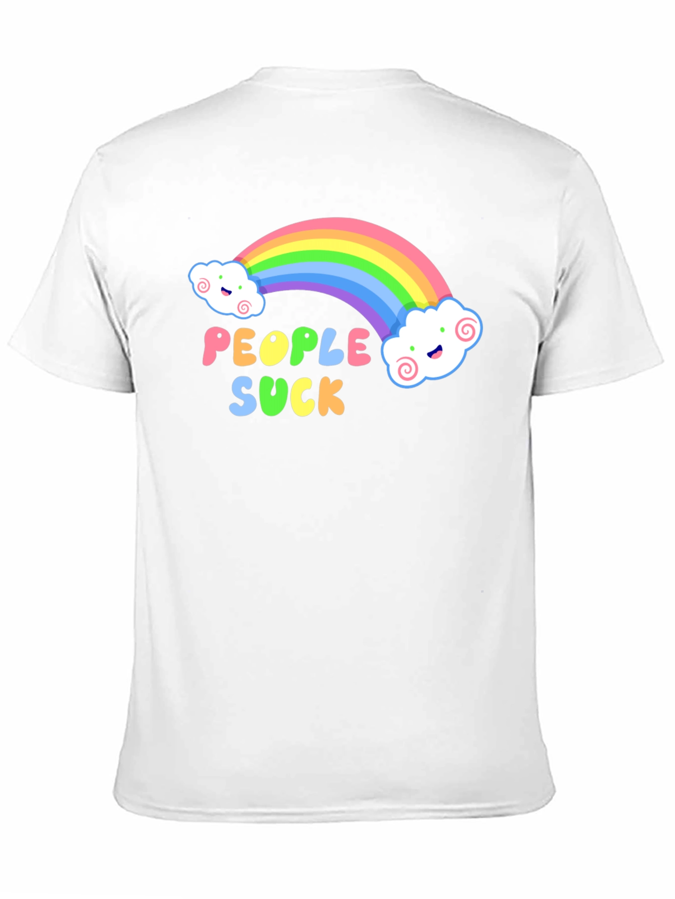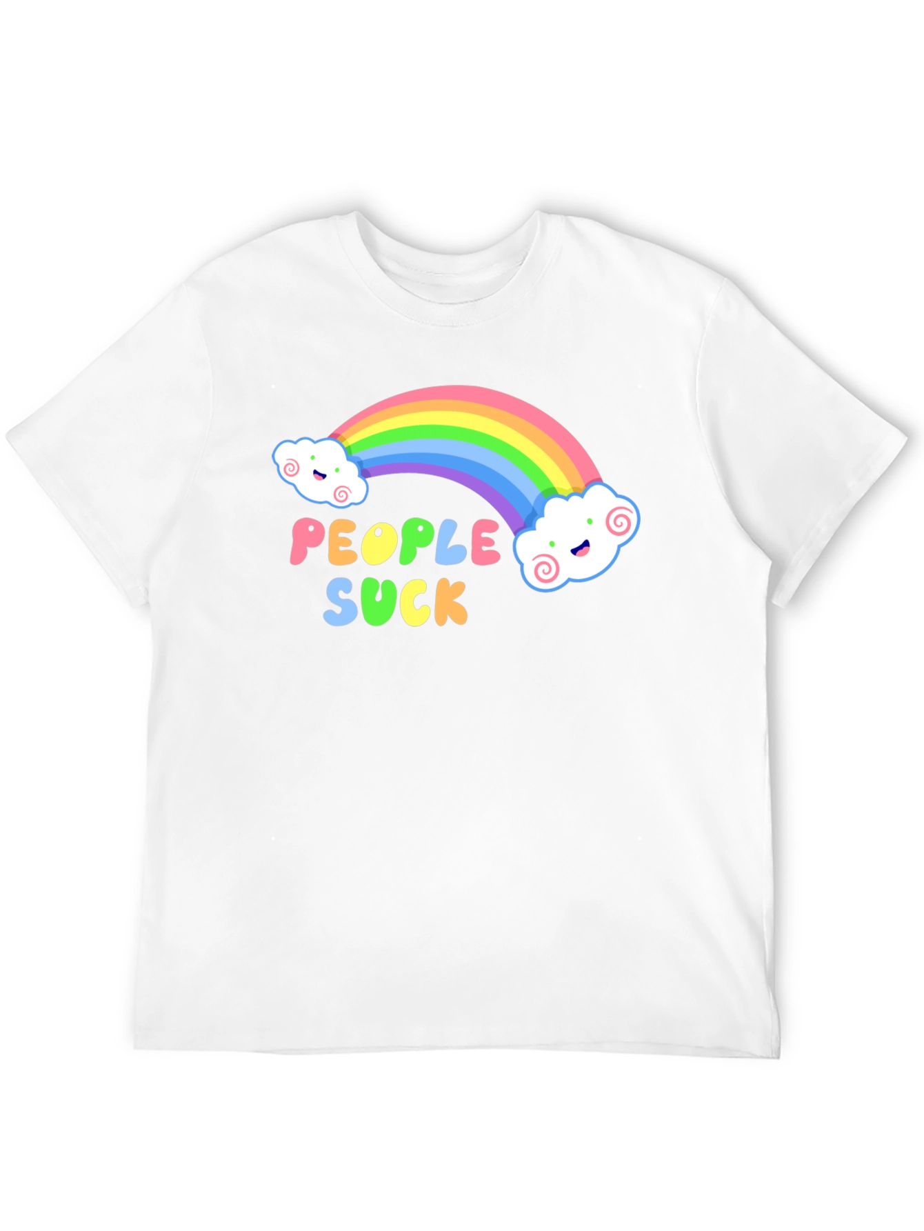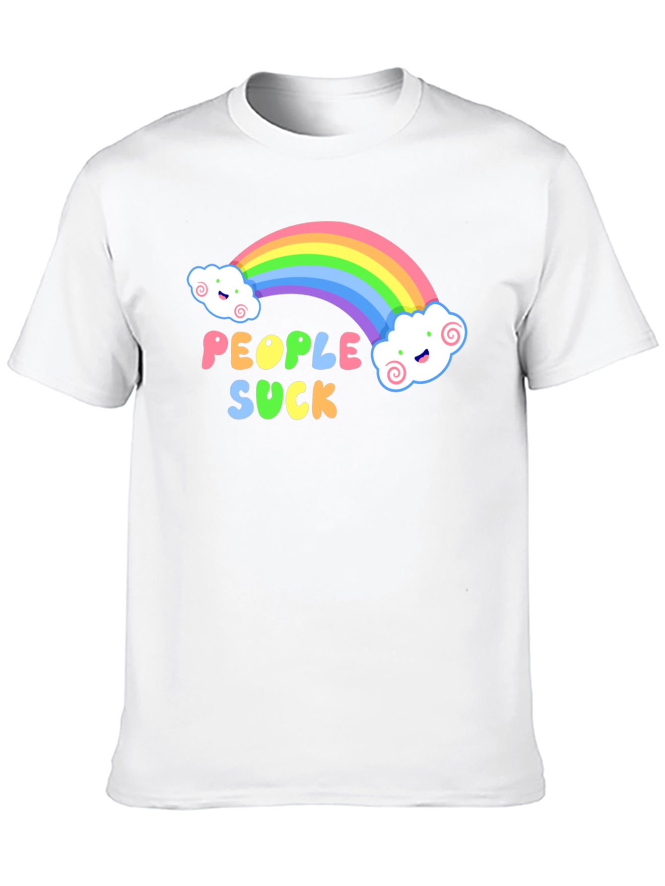 Show off your unique sense of humor with this eye-catching black t-shirt. The shirt features a colorful rainbow design with smiling cloud accents. Below the rainbow is the phrase "PEOPLE SUCK" in a playful, contrasting font. Made from a comfortable-looking material, this tee is perfect for casual wear. Wear it to express your individuality and make a statement. It is Ideal for everyday wear, casual outings, or as a conversation starter. Pair it with jeans, shorts, or a skirt for a relaxed and stylish look. Let your tee do the talking!