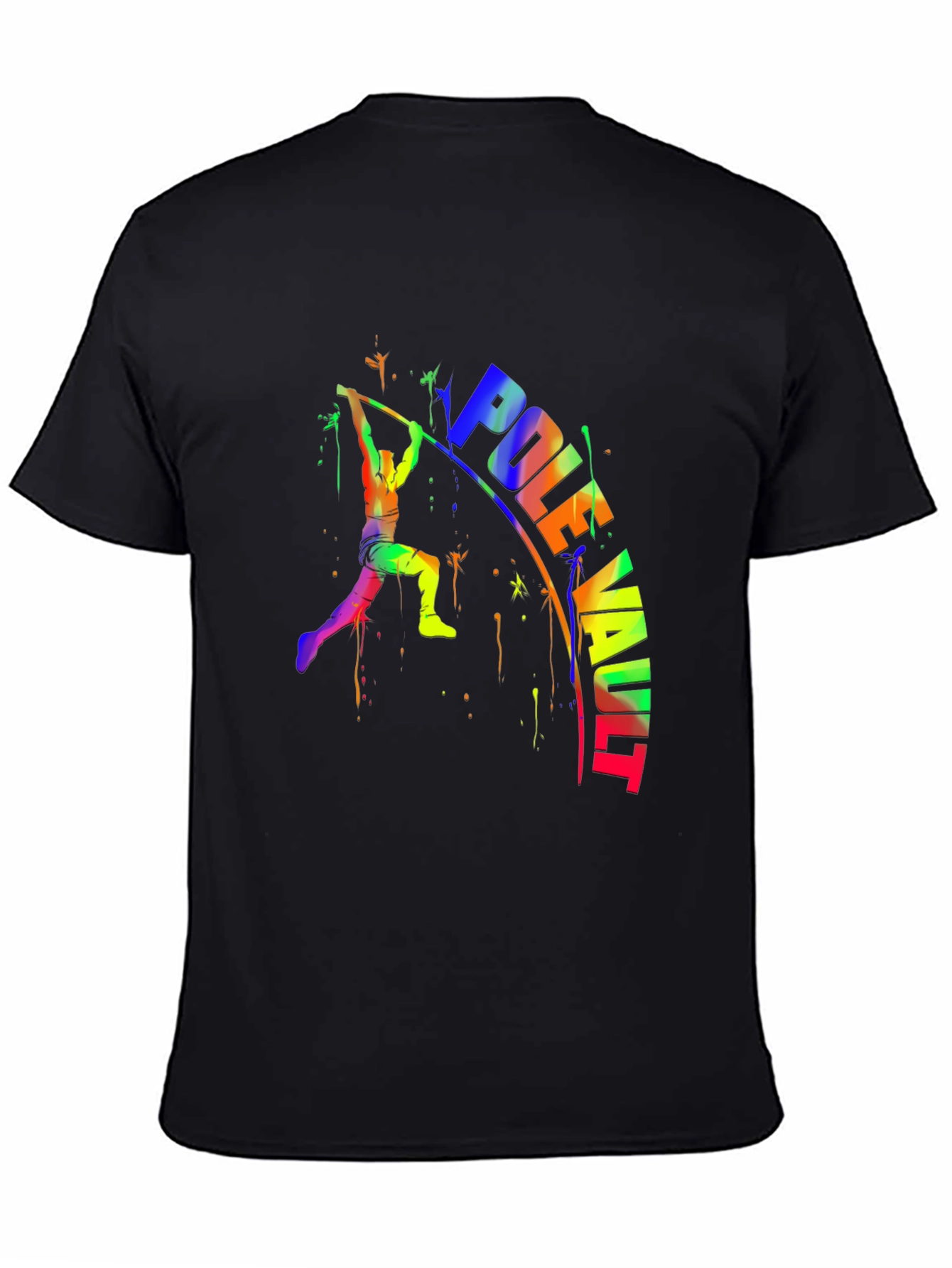 Show your love for pole vaulting with this vibrant black t-shirt. Featuring a colorful rainbow-style graphic of a pole vaulter in action, it's perfect for athletes and fans alike. The eye-catching design and comfortable fit make it a standout piece for casual wear or training. The shirt is perfect for sports enthusiasts who want to make a statement. Get yours today and let your passion shine!