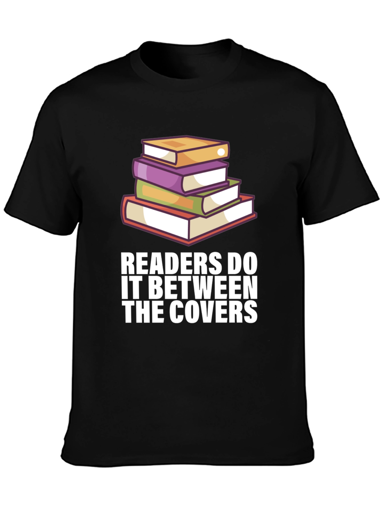 Show off your love for reading with this eye-catching black t-shirt. The design features a stack of colorful books in yellow, purple, green and red tones, topped with the witty text "READERS DO IT BETWEEN THE COVERS". Made from a comfortable-looking fabric, this tee is perfect for casual wear, library visits, book club meetings, or simply lounging at home with a good book. Its humorous design makes it an excellent conversation starter and a fun gift for any bookworm or literature enthusiast. Get yours today and wear your passion proudly!