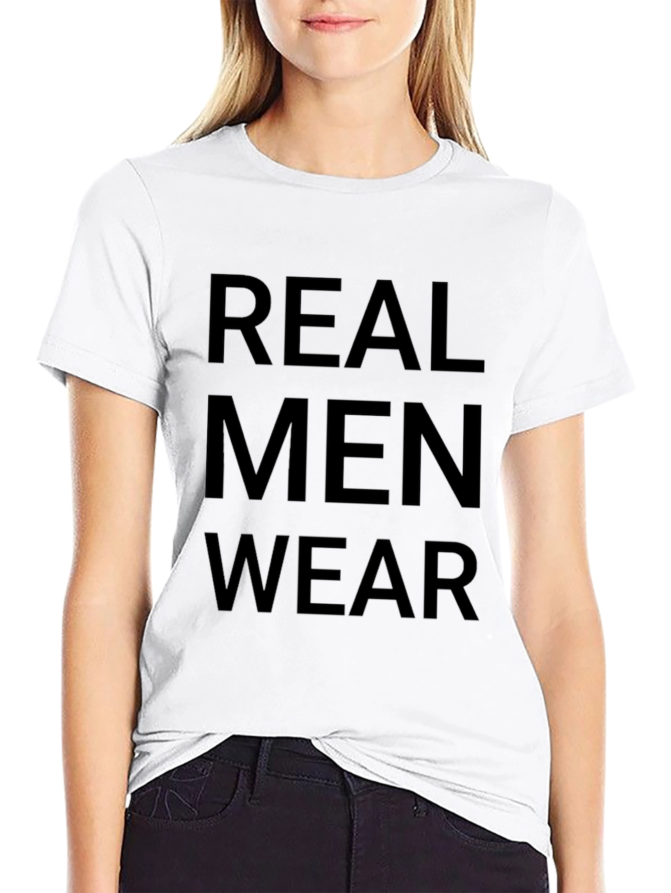 Make a statement with this bold black t-shirt featuring the text "REAL MEN WEAR." Crafted from a comfortable, breathable fabric, this tee is perfect for everyday wear. The classic fit ensures a relaxed and stylish look, whether you're heading to a casual outing or simply lounging at home. Pair it with jeans or shorts for a versatile ensemble that exudes confidence and individuality. Show off your unique sense of style with this must-have addition to your wardrobe. Ideal for those who want to express themselves, this t-shirt is a conversation starter and a reflection of your personality. Grab yours today and let your clothing do the talking!