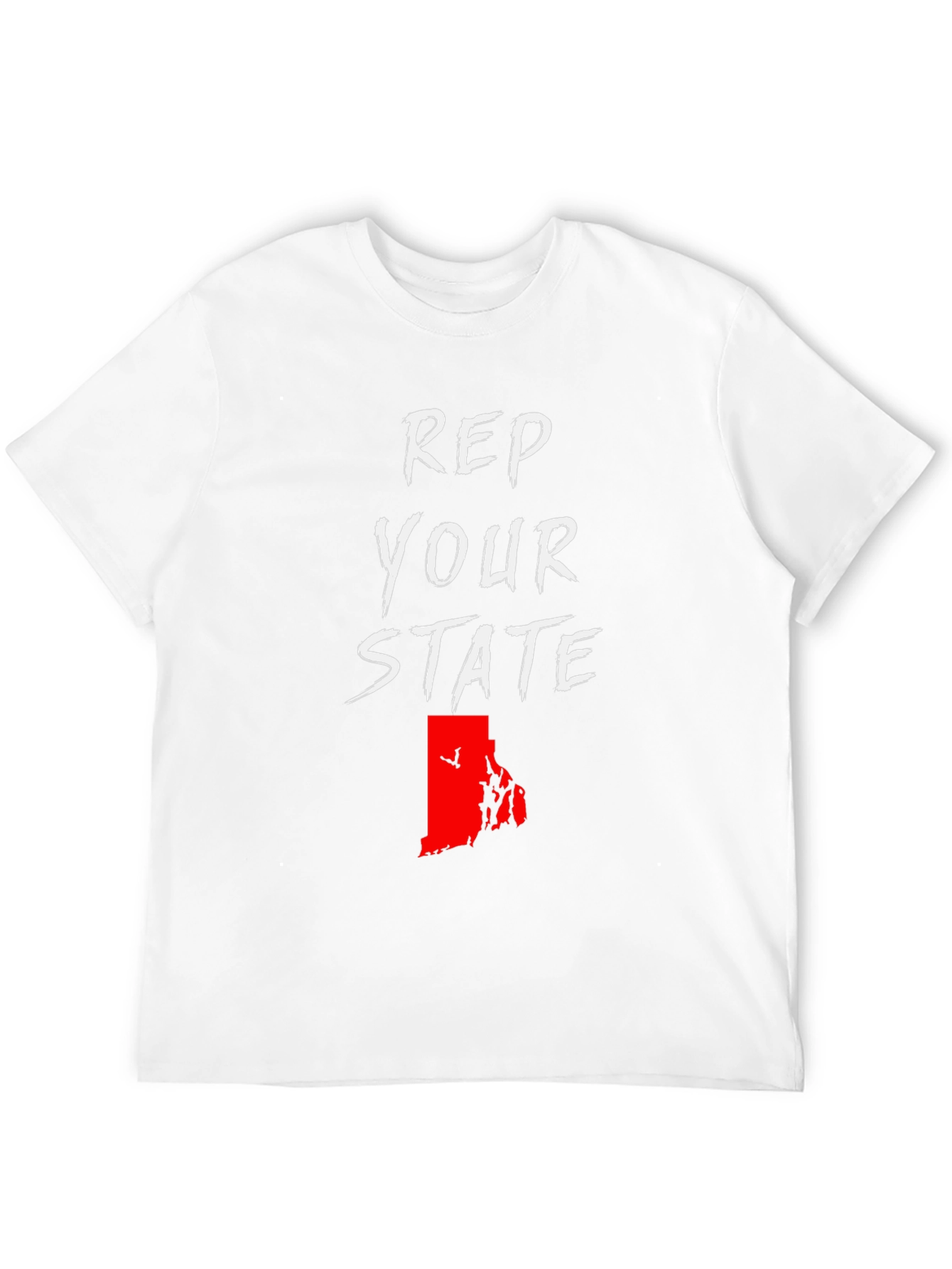 Show off your state pride with this stylish black t-shirt. The shirt features the phrase "REP YOUR STATE" in bold, white lettering above a vibrant red silhouette of Rhode Island. Made from a soft-looking cotton blend, this tee appears comfortable and durable. The design is perfect for casual wear, sporting events, or as a unique gift for Rhode Island natives and enthusiasts. Let everyone know where your heart lies with this eye-catching and comfortable state pride t-shirt.