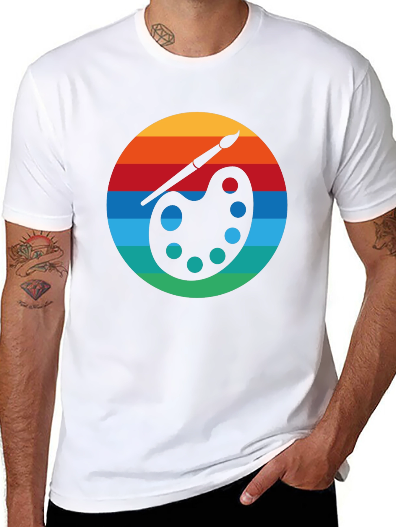 Show off your creative side with this vibrant graphic t-shirt! This eye-catching tee features a retro-inspired design of an artist's palette with a paintbrush, set against colorful horizontal stripes reminiscent of a vintage sunset. The bold black backdrop makes the vivid colors pop. Made from a comfortable, breathable fabric, this t-shirt is perfect for casual wear, art classes, or expressing your love for creativity. Ideal for artists, art enthusiasts, or anyone who appreciates unique and stylish apparel. Get ready to make a statement with this artistic piece!