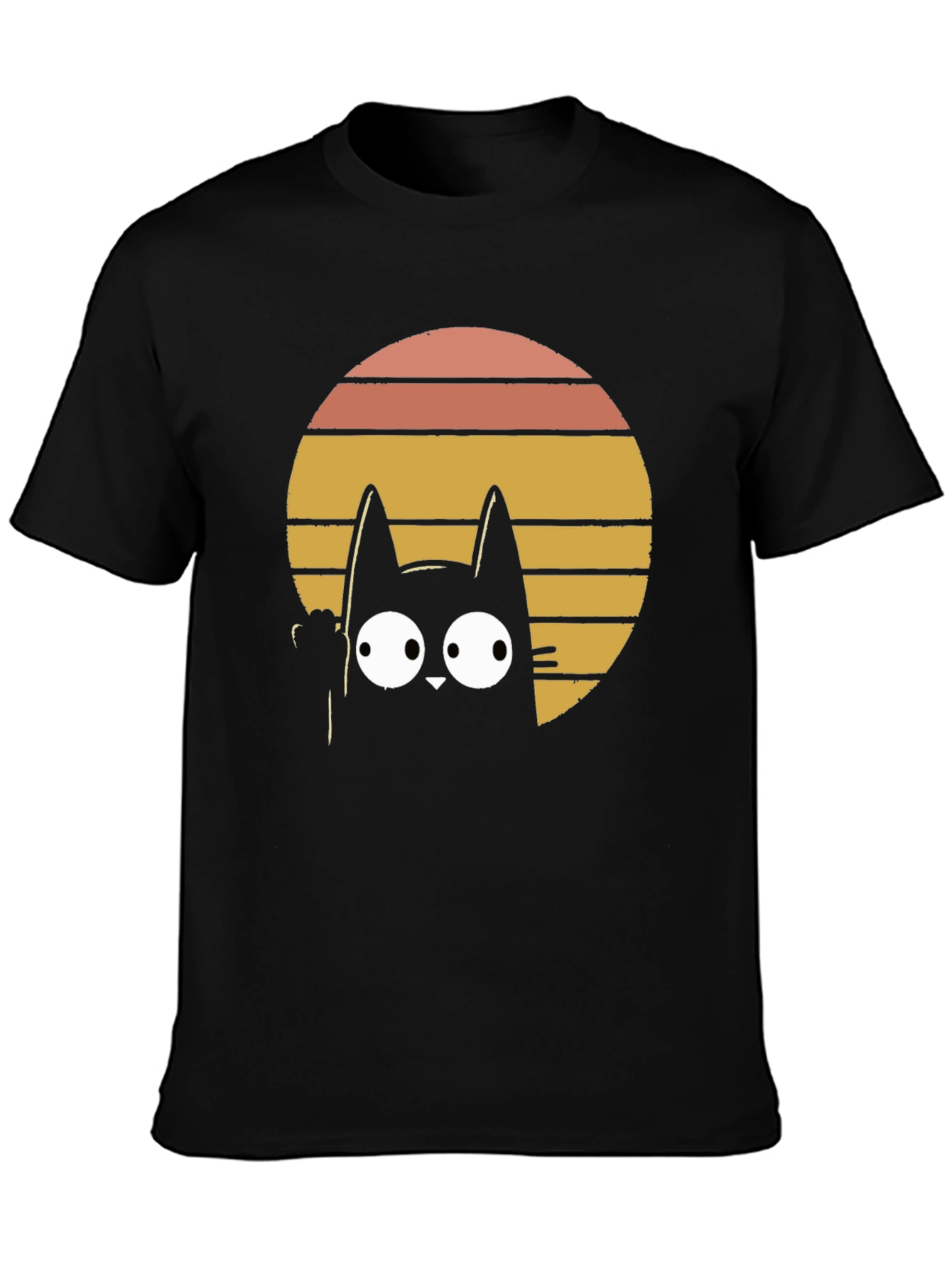 Embrace a touch of whimsy with this eye-catching black graphic tee. Made from a soft, comfortable fabric, this shirt features a retro-inspired design of a black cat peeking out from behind a striped sunset. The bold graphic adds a playful, stylish element to your casual wardrobe. Perfect for cat lovers and those who appreciate vintage aesthetics. Pair it with jeans or shorts for a relaxed, trendy look. A great conversation starter and a fun way to express your unique style.