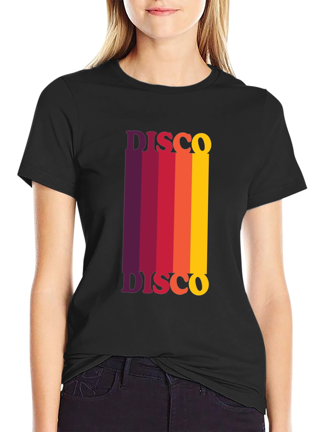 Step back in time with this awesome retro disco t-shirt! The shirt features a vibrant color gradient design with the word 'DISCO' printed above and below. The color stripes include shades of purple, red, orange, and yellow, which gives a true vintage 70's vibe. Made from a soft, breathable material, it's comfortable enough for everyday wear and perfect for themed parties, dance events, or just showing off your love for classic disco music. Pair it with jeans or vintage pants for a complete retro look. Get ready to groove in style!