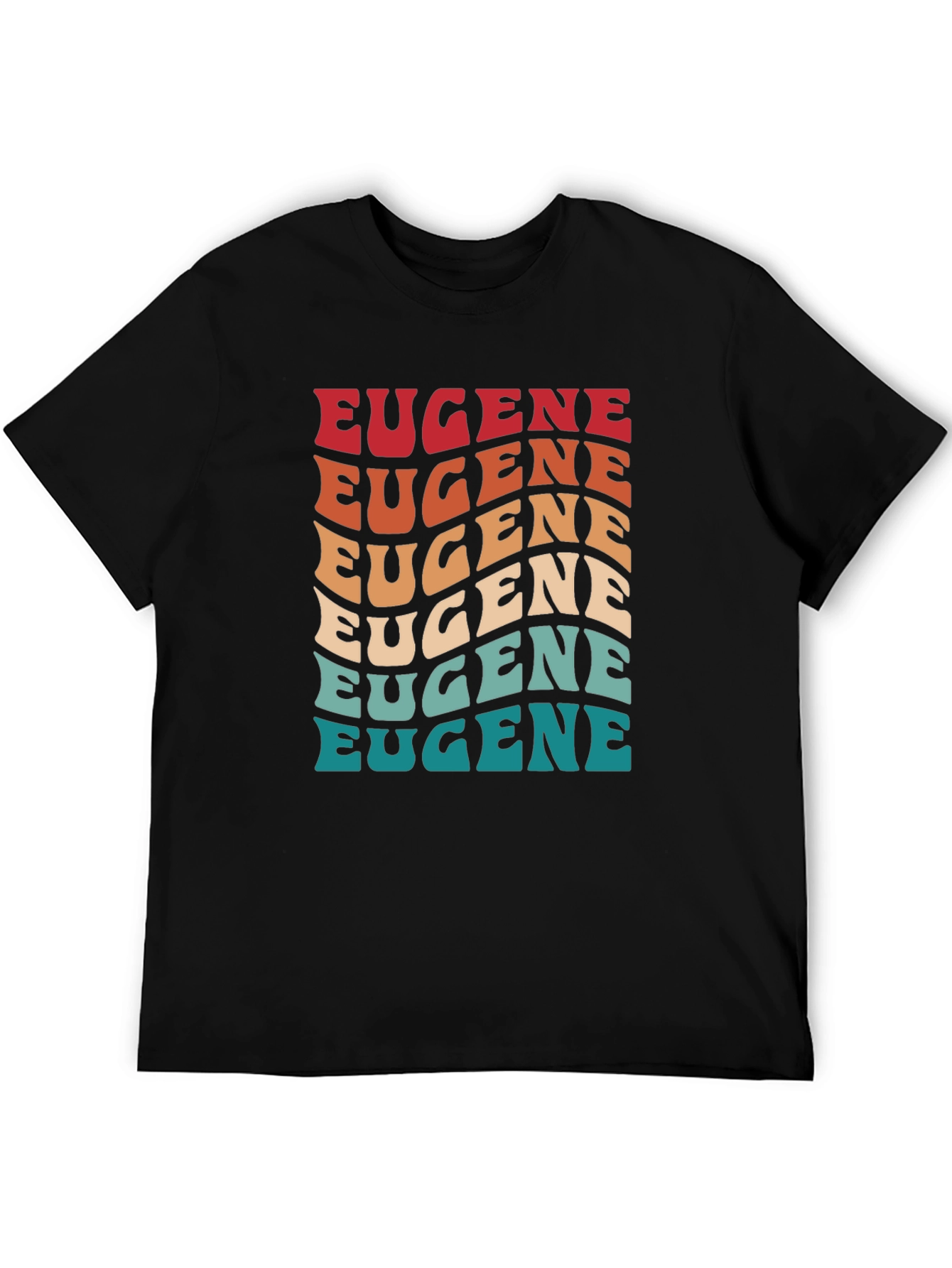 Rock a vintage vibe with this unique 'Eugene' T-shirt. The shirt features the name 'Eugene' printed multiple times in a stacked, wavy design with retro-inspired colors. The playful distortion gives the shirt a stylish, standout look. Made from comfortable material and with a classic crew neck, this shirt is perfect for everyday wear or for making a statement. Whether you're an Eugene yourself or just love the design, this Tee is sure to turn heads. Pair it with jeans for a casual look or dress it up with a blazer. A cool gift idea!