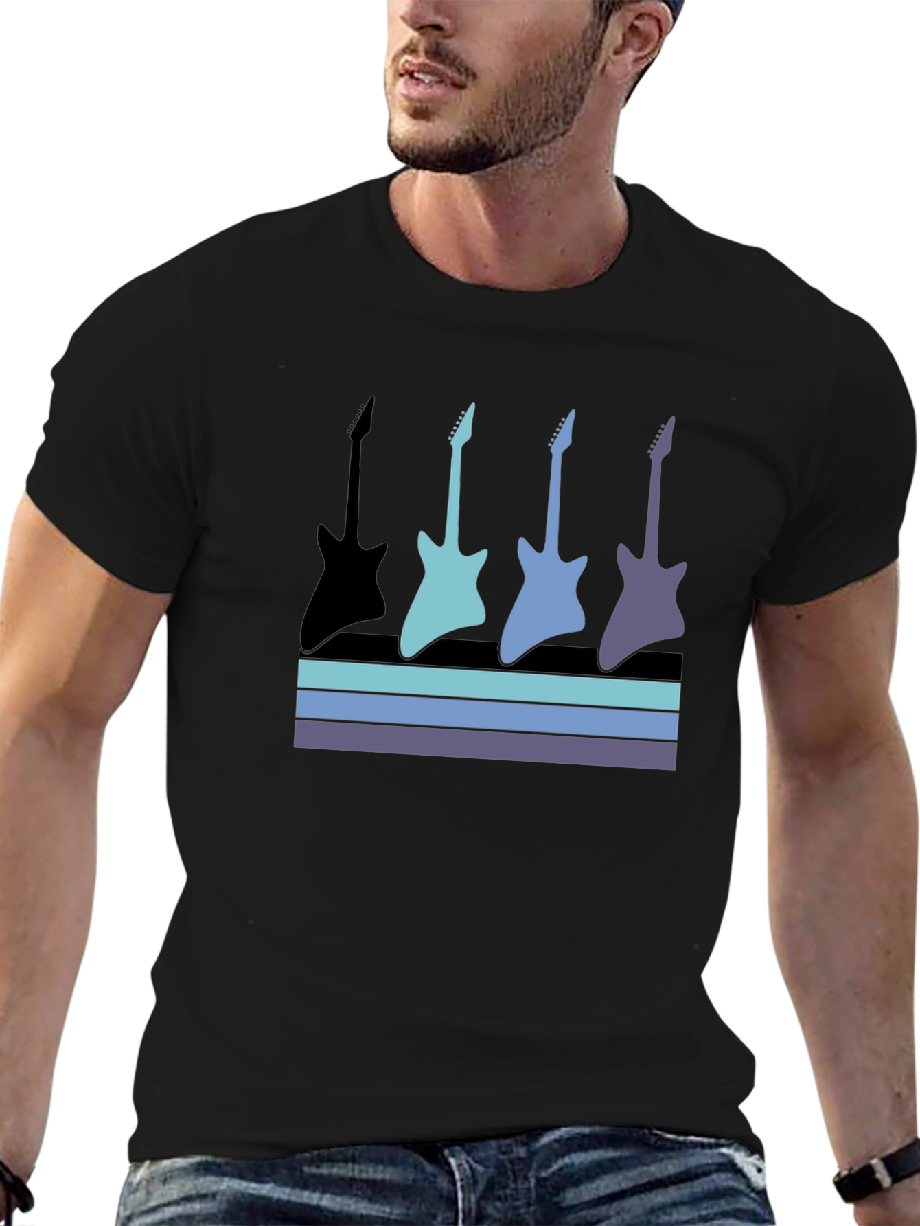Rock your style with this unique graphic tee! Featuring a cool retro design of electric guitars in varying shades, offset by horizontal stripes, this shirt is sure to turn heads. Made from a soft, comfortable fabric, this tee is perfect for everyday wear, concerts, or casual hangouts with friends. The bold design stands out against the solid black background. Show off your love for music with this must-have wardrobe staple!
