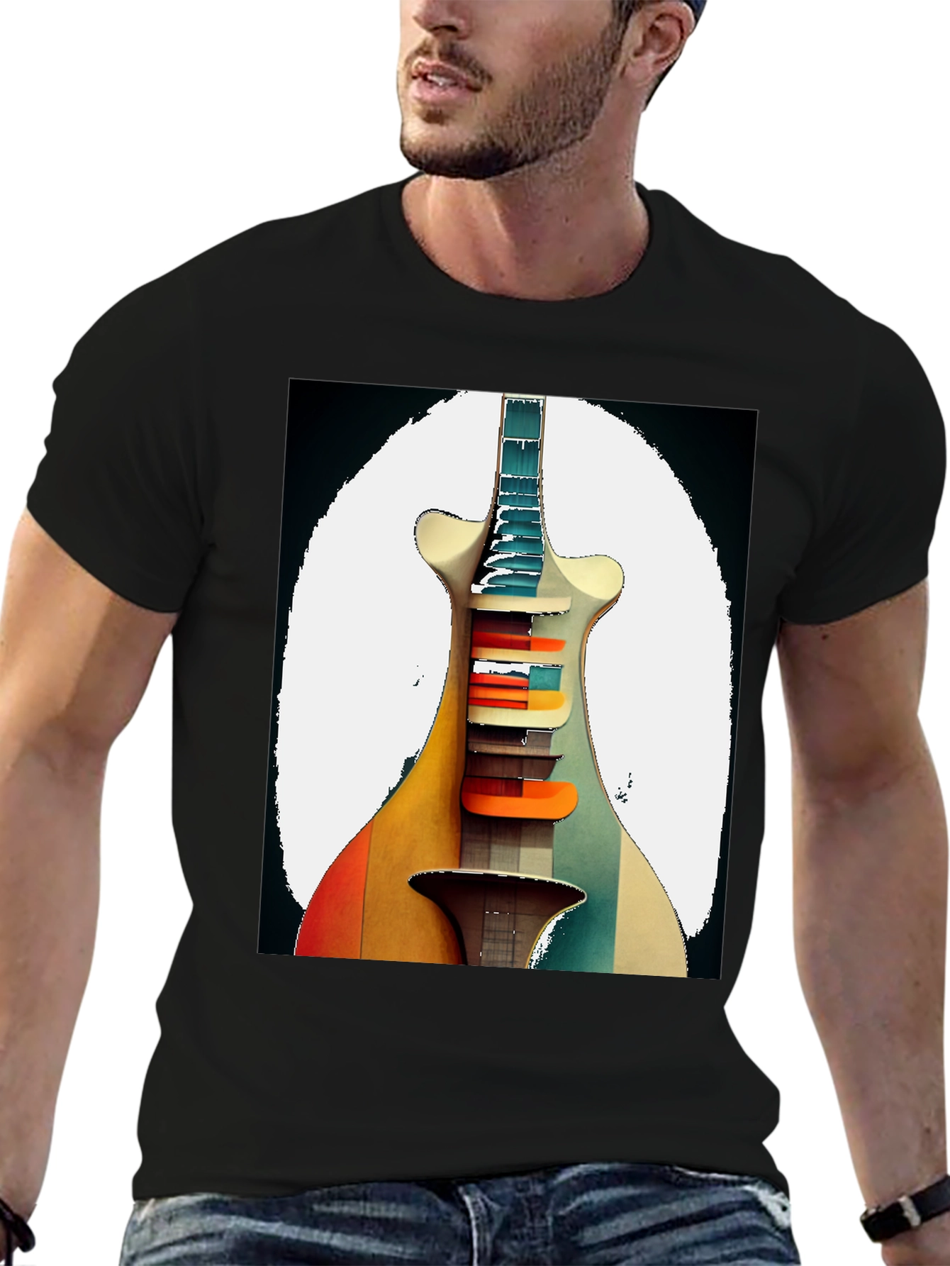 Rock a vintage vibe with this unique graphic tee! Featuring a stylized, colorful guitar design, this shirt is perfect for music lovers and anyone who appreciates retro aesthetics. The vibrant colors and eye-catching graphic make this tee a standout piece. Made from soft, comfortable fabric, it's ideal for everyday wear or a casual night out. Show off your passion for music and timeless style with this awesome guitar tee. A great addition to any wardrobe!