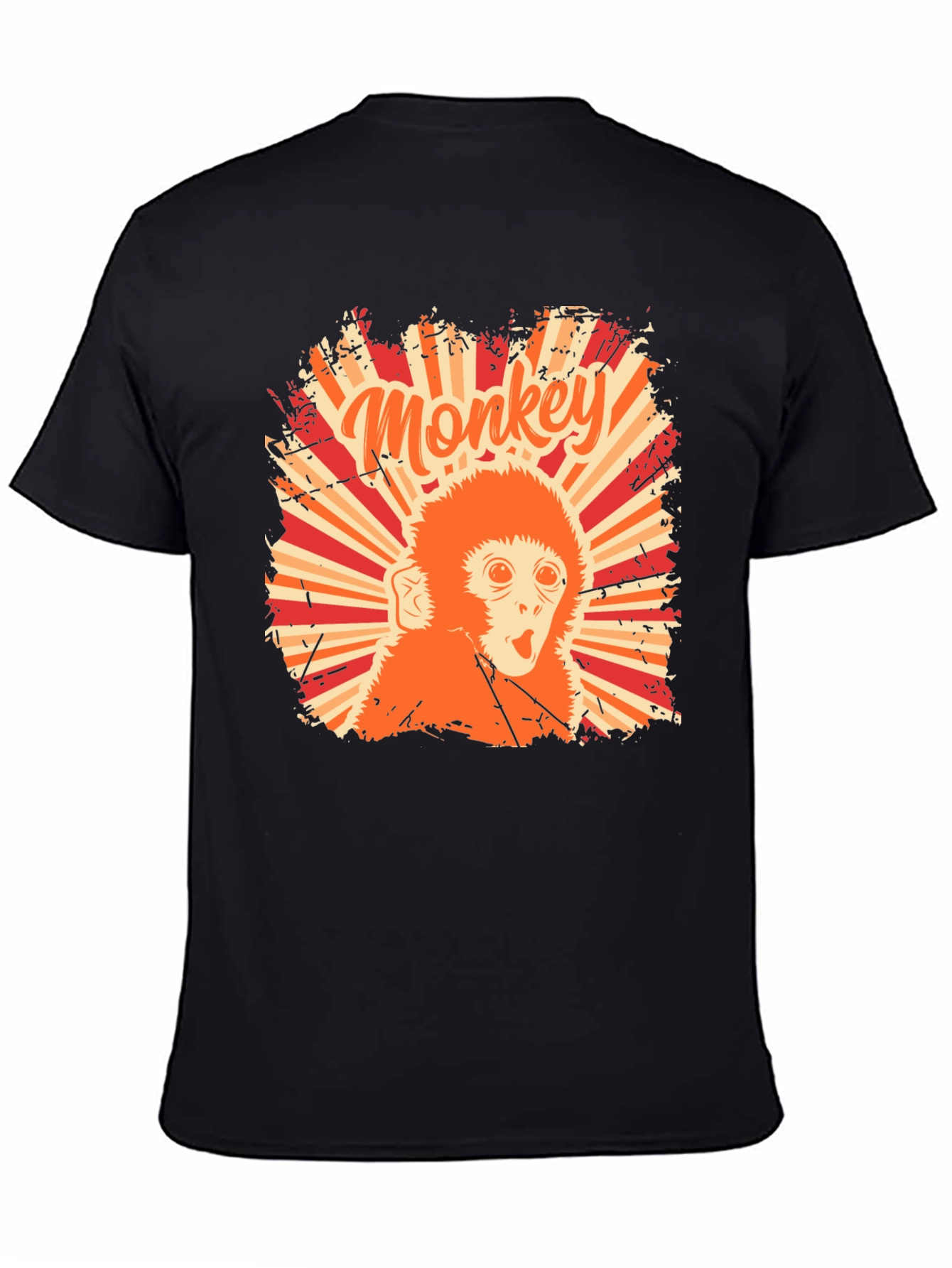 Show off your playful side with this eye-catching black t-shirt. The shirt features a retro-style graphic of a surprised-looking monkey, overlaid on a burst of orange and beige stripes. The word "Monkey" is written in a stylized font above the design. This comfortable shirt is perfect for casual wear, parties, or as a fun gift for animal lovers. Made from soft, breathable fabric, it offers both style and comfort. Stand out from the crowd with this unique and attention-grabbing tee!