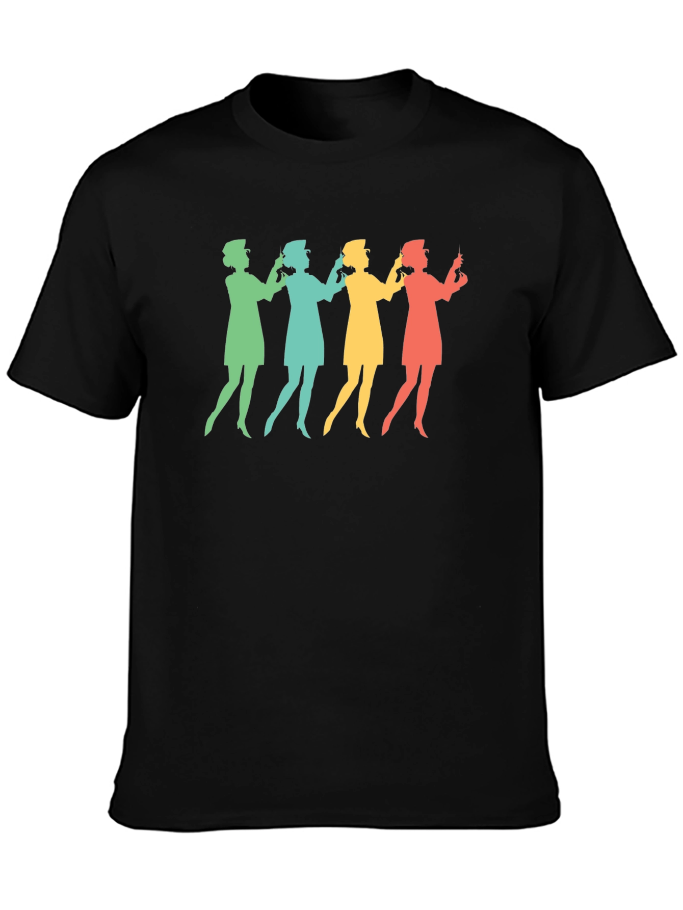 Show your appreciation for nurses with this vintage-inspired t-shirt. Featuring a retro silhouette design of four nurses in various colors, this shirt is both stylish and meaningful. The solid black backdrop makes the colorful nurses pop. Made from a comfortable-looking material, this t-shirt is perfect for everyday wear. Wear it to work, casual outings, or as a statement piece to honor healthcare professionals. A great gift for nurses, nursing students, or anyone who admires these heroes.