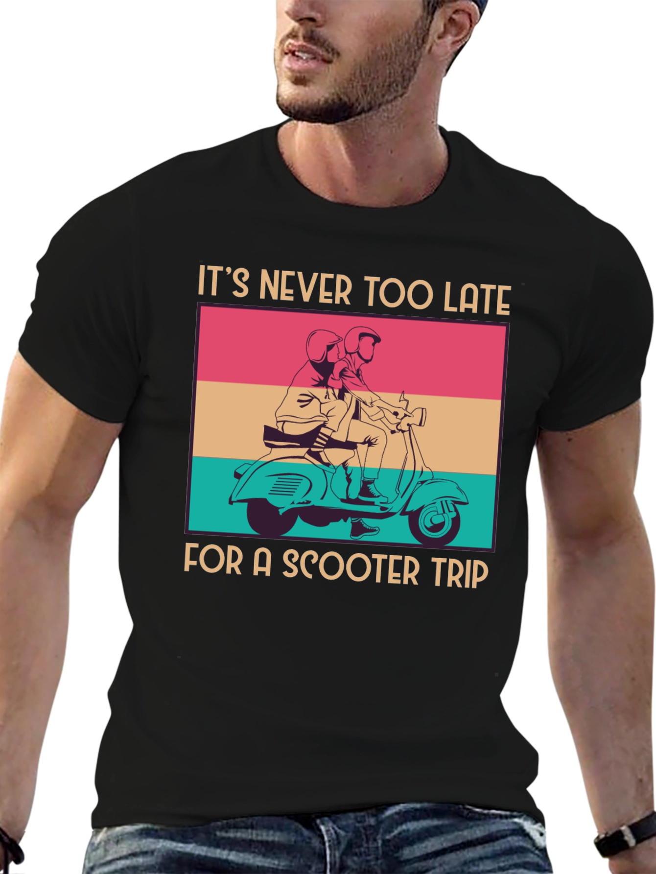 Embrace vintage vibes with this stylish black tee featuring a retro-inspired graphic. The design showcases a classic scooter scene with two people riding against a backdrop of pink, beige, and teal stripes, accompanied by the quote 'It's Never Too Late for a Scooter Trip.' Made from a comfortable fabric, this short-sleeve shirt is perfect for casual wear. Show off your love for vintage aesthetics and scooter adventures with this unique and eye-catching t-shirt. Great for everyday wear or as a gift for scooter enthusiasts.