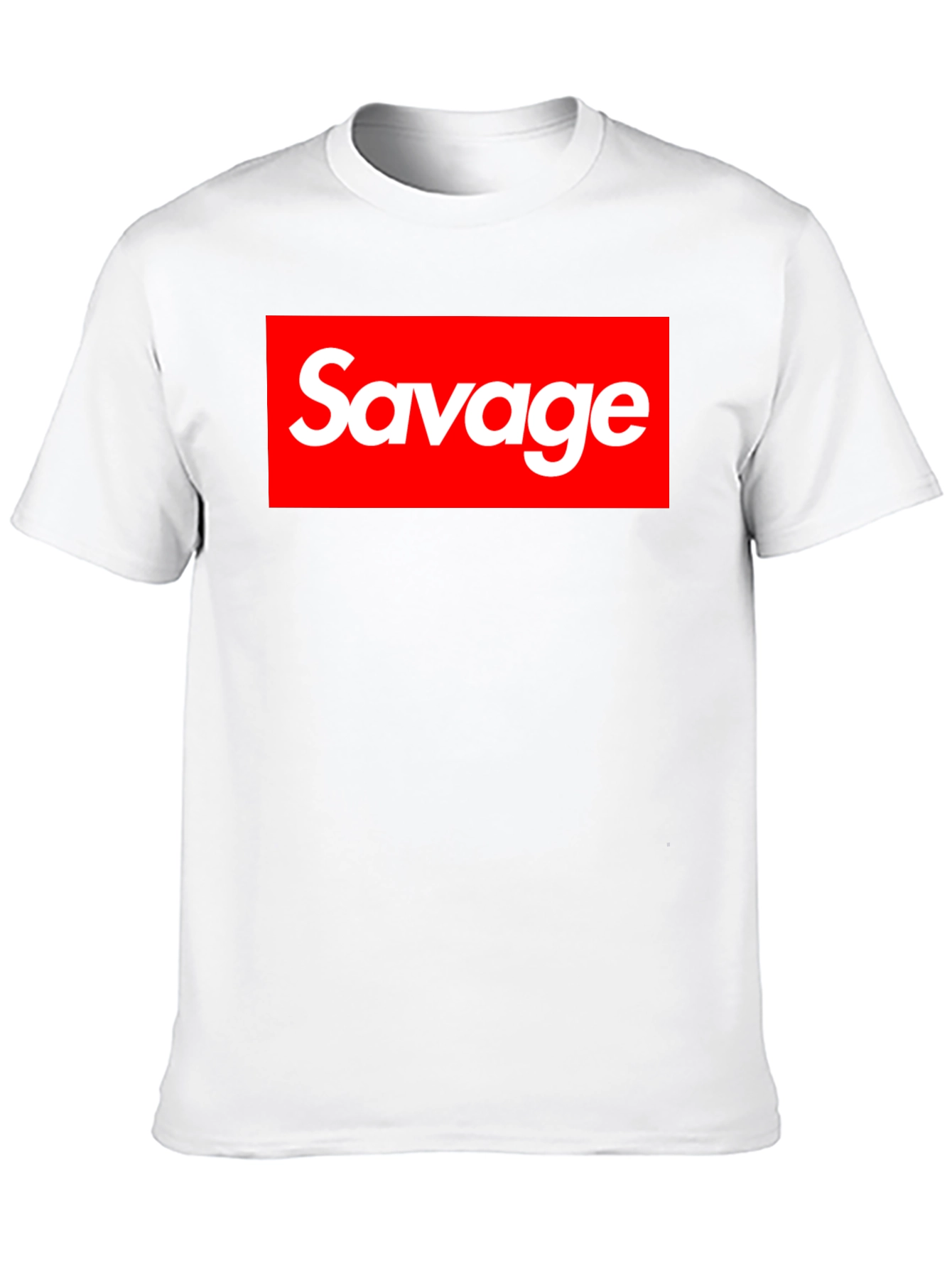 Show off your edgy style with this bold Savage graphic tee. Featuring a striking white "Savage" text on a vibrant red rectangular background, this t-shirt is sure to make a statement. Made from comfortable and durable black fabric, this tee offers a classic fit that's perfect for everyday wear. Ideal for casual outings, streetwear fashion, or expressing your unique personality. Stand out from the crowd with this must-have graphic tee and add some bold attitude to your wardrobe.