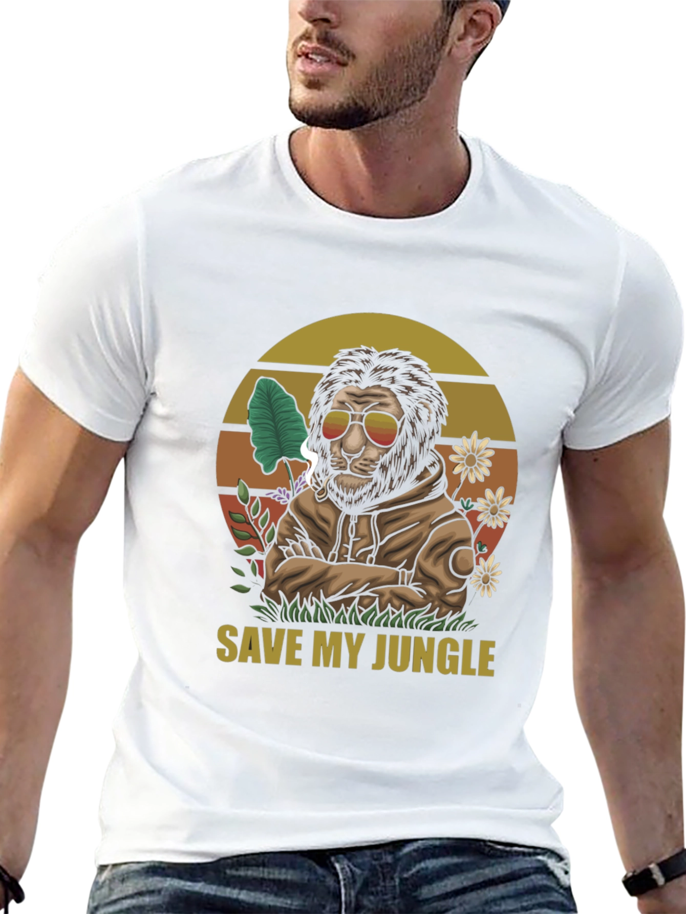 Embrace a vintage vibe with this black graphic tee. The design features a cool, anthropomorphic lion wearing sunglasses and a jacket, surrounded by plants and flowers against a retro sunset backdrop. The phrase "SAVE MY JUNGLE" adds an environmental message. Made from comfortable fabric, this tee is perfect for casual wear, expressing your love for wildlife and a touch of retro style. Pair it with jeans or shorts for an effortlessly cool look. Let your fashion roar with purpose!