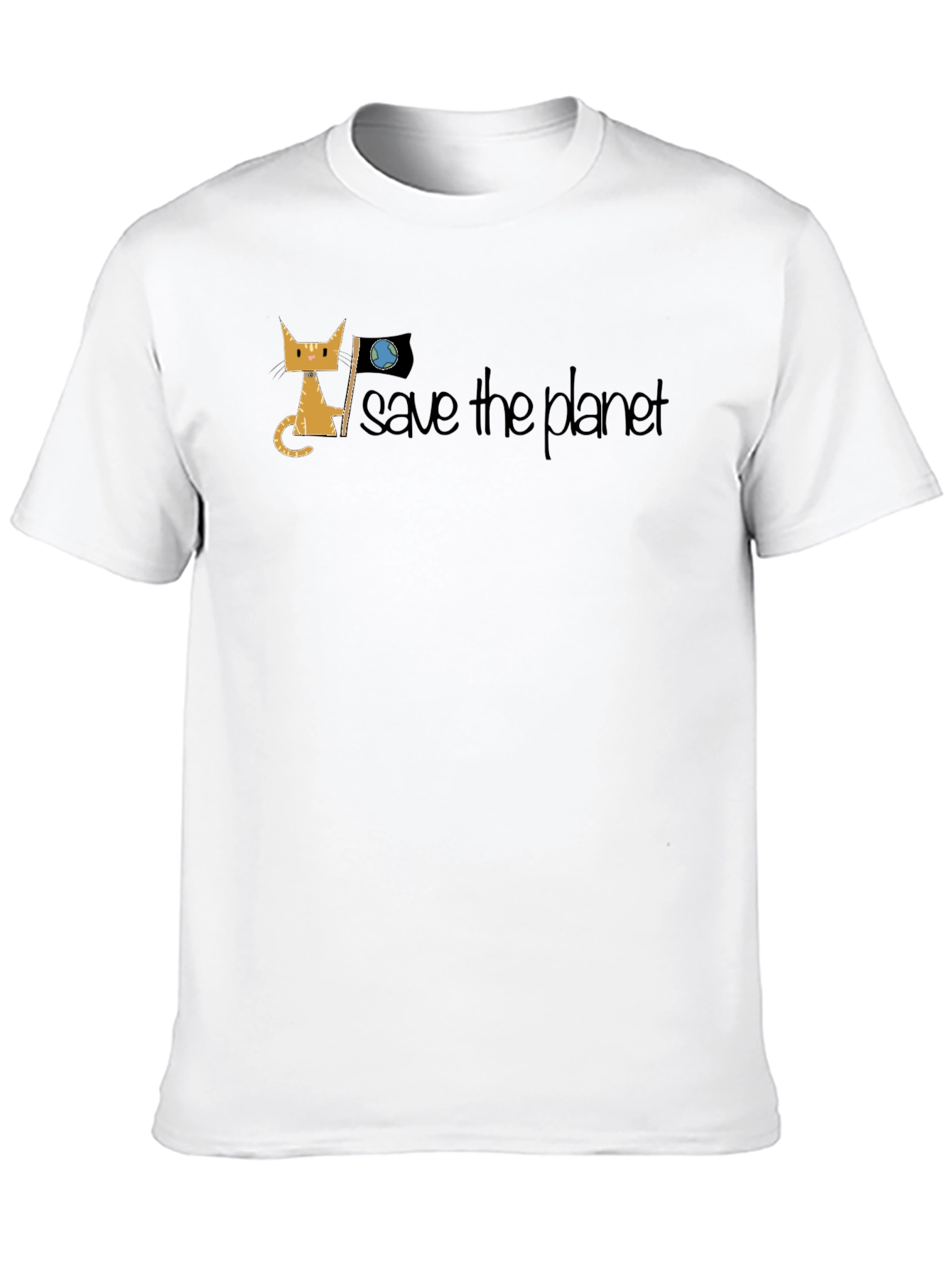 Show your support for environmentalism with this stylish black graphic t-shirt. The shirt features a unique design with a cartoon cat holding a flag with a earth on it and the phrase "save the planet." Made from what appears to be a comfortable and durable material, this shirt is perfect for everyday wear. Its casual style makes it ideal for pairing with jeans, shorts, or your favorite casual bottoms. Wear it to school, work, or environmental awareness events. A great way to express your passion for protecting our planet!