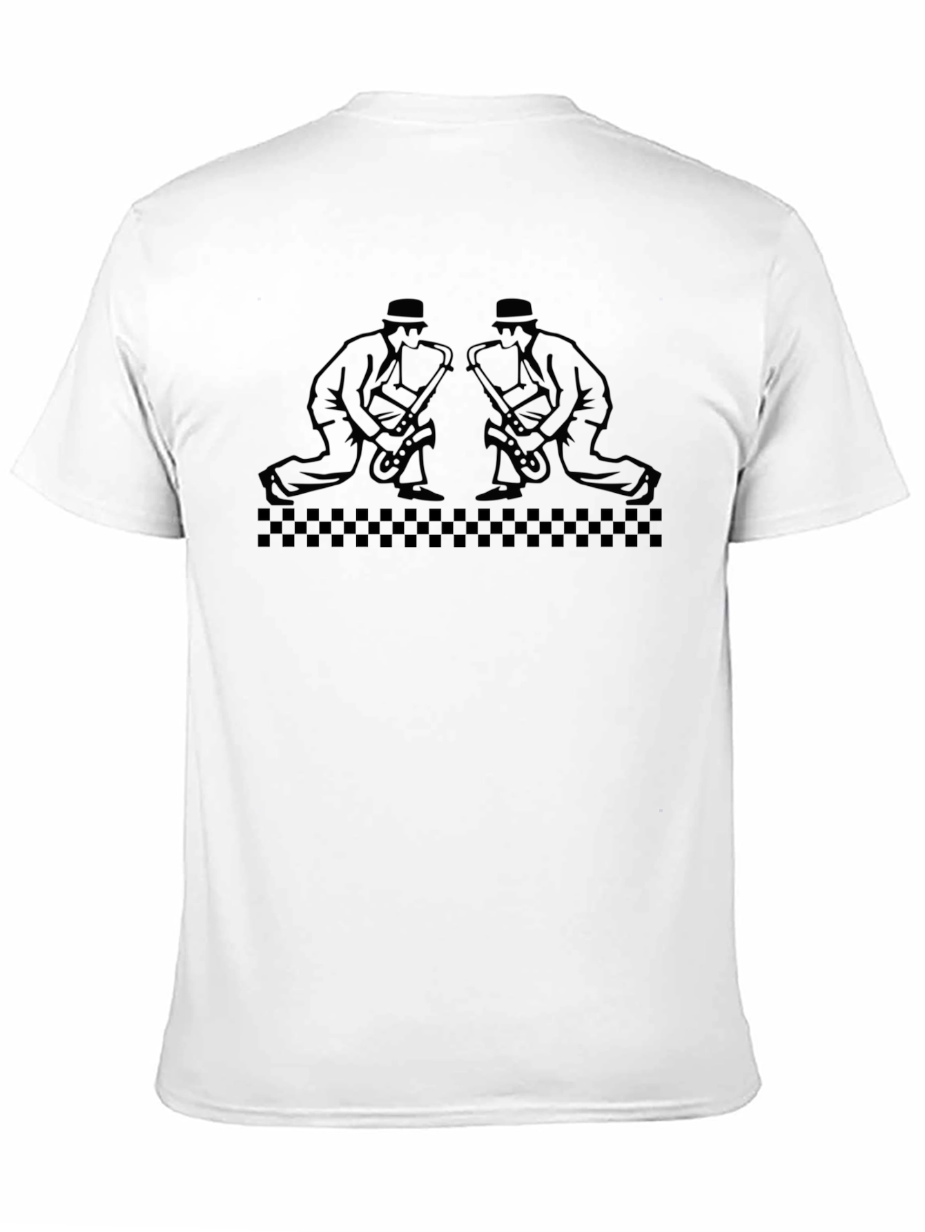 Showcase your love for music with this stylish black t-shirt. The shirt features a unique graphic of two men with saxophones above a checkerboard pattern, giving it a cool and vintage vibe. Made from comfortable, breathable fabric, this tee is perfect for everyday wear or for showing off your style at music events. The black color provides a versatile base, easily paired with jeans, shorts, or layered under a jacket. Make a statement with this eye-catching t-shirt, a must-have for music lovers and fashion enthusiasts alike.