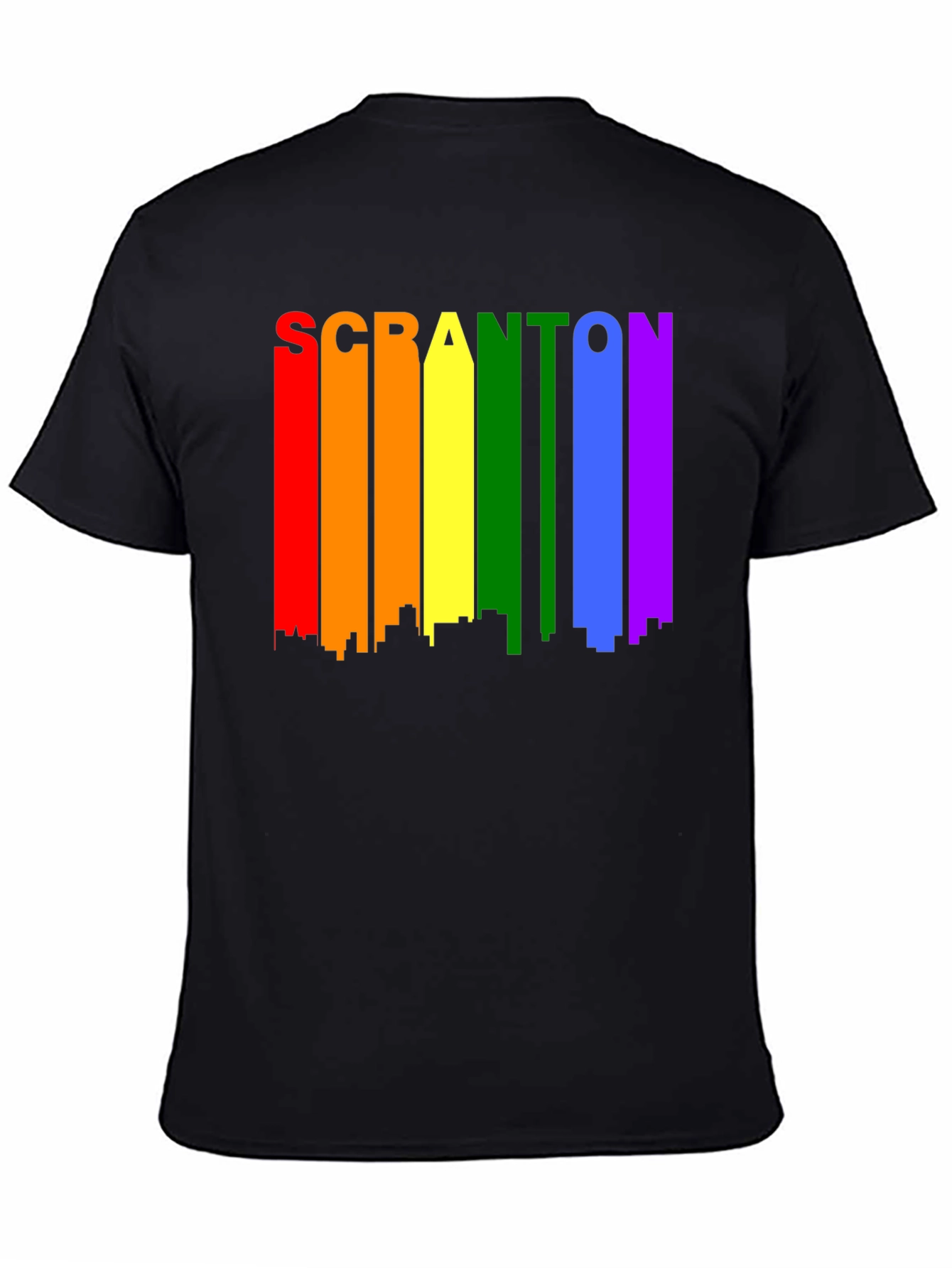Show your love for Scranton with this unique graphic t-shirt. The design features the city name "SCRANTON" in rainbow colors above a silhouetted cityscape. The vivid, bold colors are eye-catching, and the black background makes the design pop. Made from a soft, comfortable fabric, this shirt is perfect for everyday wear. Wear it to show your pride in Scranton, or give it as a gift to someone who loves this city. It's a stylish way to express your appreciation for this vibrant community.