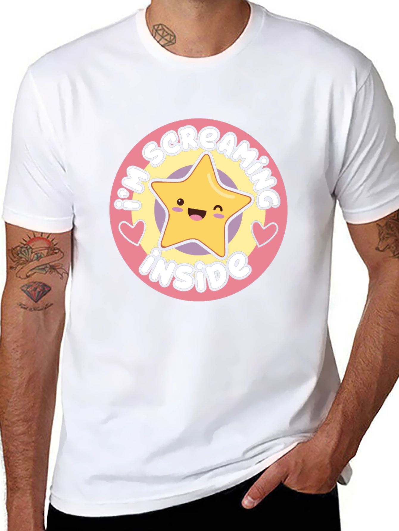 Express your inner feelings with this fun and quirky black t-shirt! Featuring a cute, winking yellow star surrounded by a pink circle with the words 'I'm SCREAMING INSIDE' this tee adds a touch of humor to your wardrobe. The design also features heart details. Perfect for casual outings, lounging at home, or making a statement, this shirt is sure to turn heads and spark conversations. Embrace your emotions with style in this must-have graphic tee! Made with comfortable materials for all-day wear.
