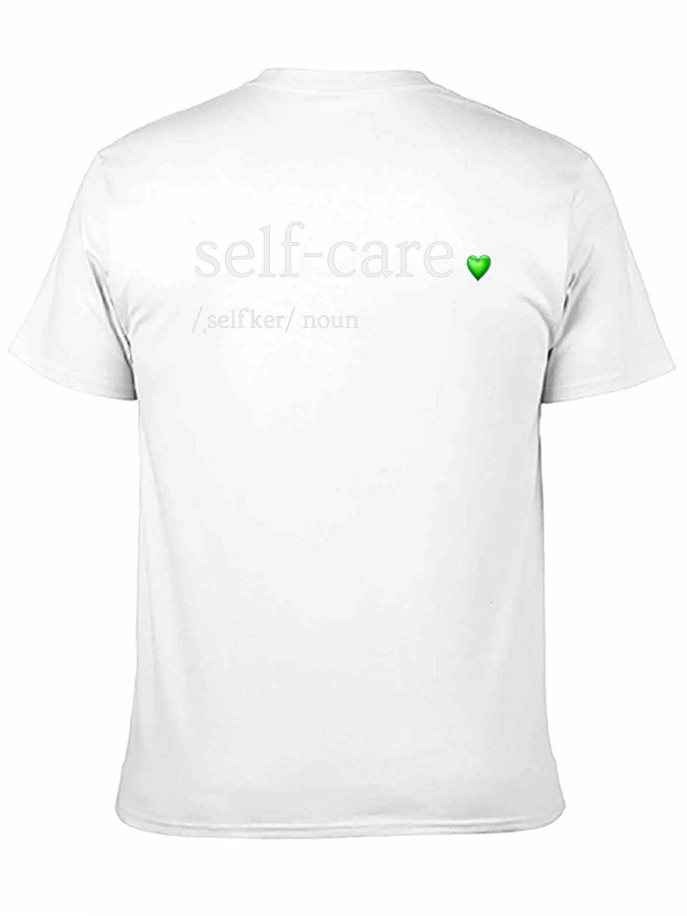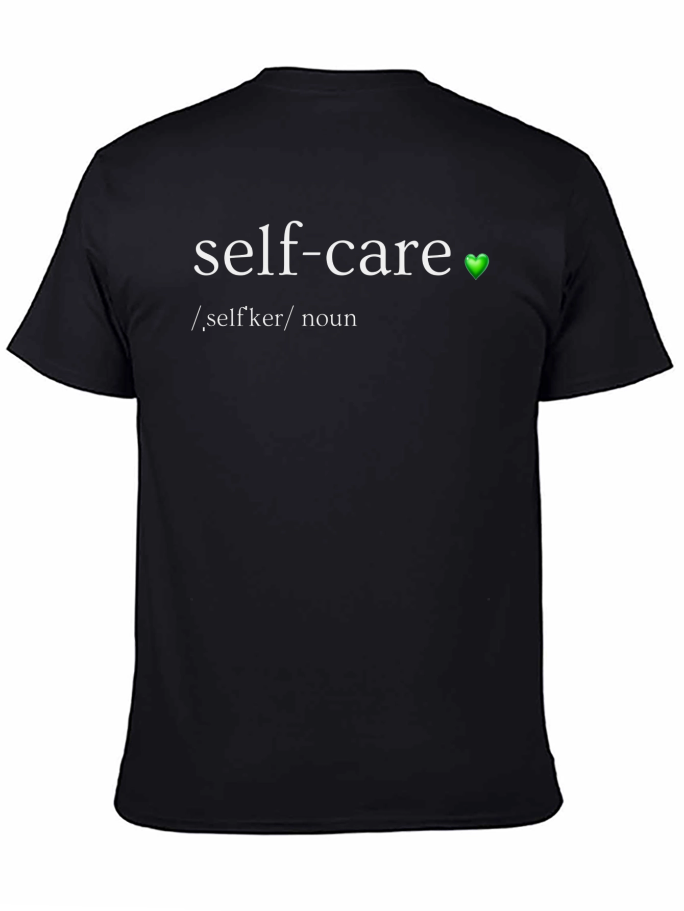 Show yourself some love with this stylish black t-shirt featuring a clean, modern design. The shirt prominently displays the text "self-care" in a crisp white font, followed by its phonetic transcription and part of speech. A vibrant green heart adds a pop of color and symbolizes the nurturing aspect of self-care. Made from a soft-looking fabric, this tee offers both comfort and style. Perfect for casual wear, yoga sessions, or simply relaxing at home. It's a gentle reminder to prioritize your well-being. Get yours today!