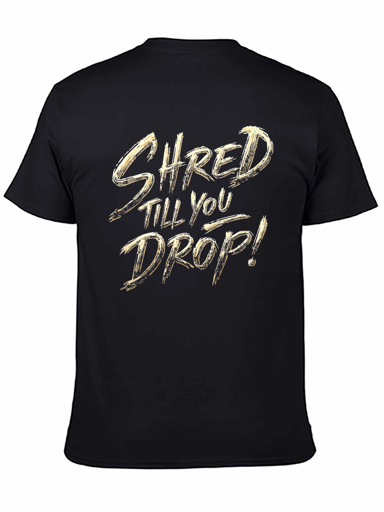 Show off your love for high-intensity sports with this stylish black graphic tee. The shirt features a bold "Shred Till You Drop!" slogan in a distressed gold font, perfect for making a statement at the gym or on the streets. Made from comfortable, breathable fabric, it's ideal for workouts, casual outings, or simply lounging around. The classic fit ensures a relaxed feel, while the eye-catching design adds a touch of edgy style to any outfit. Pair it with jeans, shorts, or joggers for a versatile, sporty look. This tee is a must-have for anyone who lives life to the fullest and isn't afraid to push their limits.