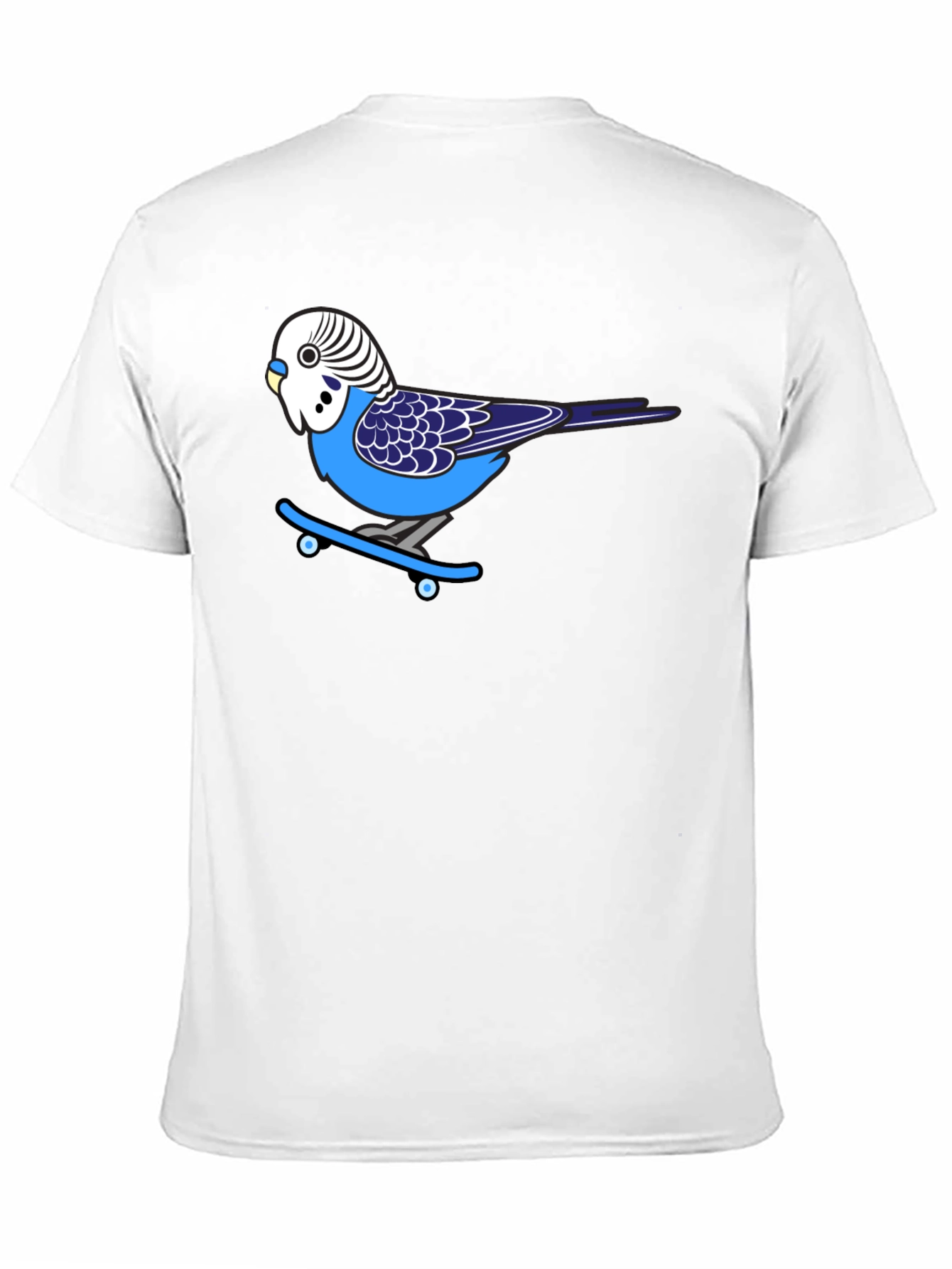 This eye-catching t-shirt features a unique design of a blue parakeet riding a skateboard. The graphic is prominently displayed on the front of the shirt, making it a fun and quirky statement piece. The shirt itself appears to be made from a comfortable, soft black cotton, perfect for everyday wear. The bold illustration is sure to spark conversation and add a touch of whimsy to your wardrobe. This tee is ideal for bird lovers, skateboard enthusiasts, or anyone who enjoys wearing original and expressive apparel. Dress it up or down, this shirt is a versatile addition to any casual outfit. It’s a great way to express your personality and stand out from the crowd. Get yours today and showcase your unique sense of style!