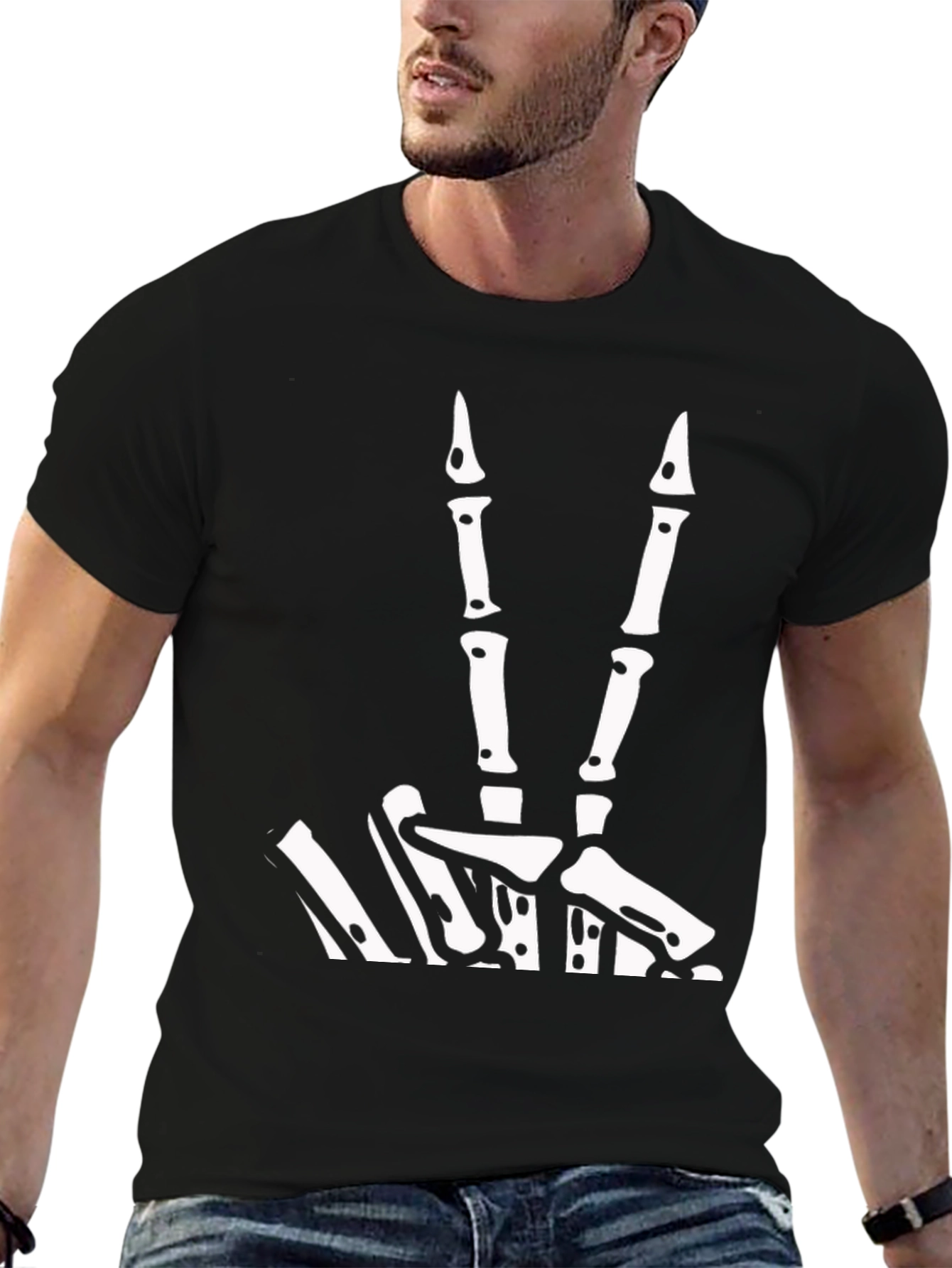 Show off your unique style with this striking black t-shirt. The shirt features a bold, white graphic of a skeleton hand giving the peace sign. Made from what appears to be a soft and breathable fabric, this tee offers both comfort and durability. The design is perfect for adding a touch of edgy humor to your wardrobe. Ideal for casual wear, concerts, or adding a statement piece to any outfit. Grab this unique tee today and rock the undead vibe!