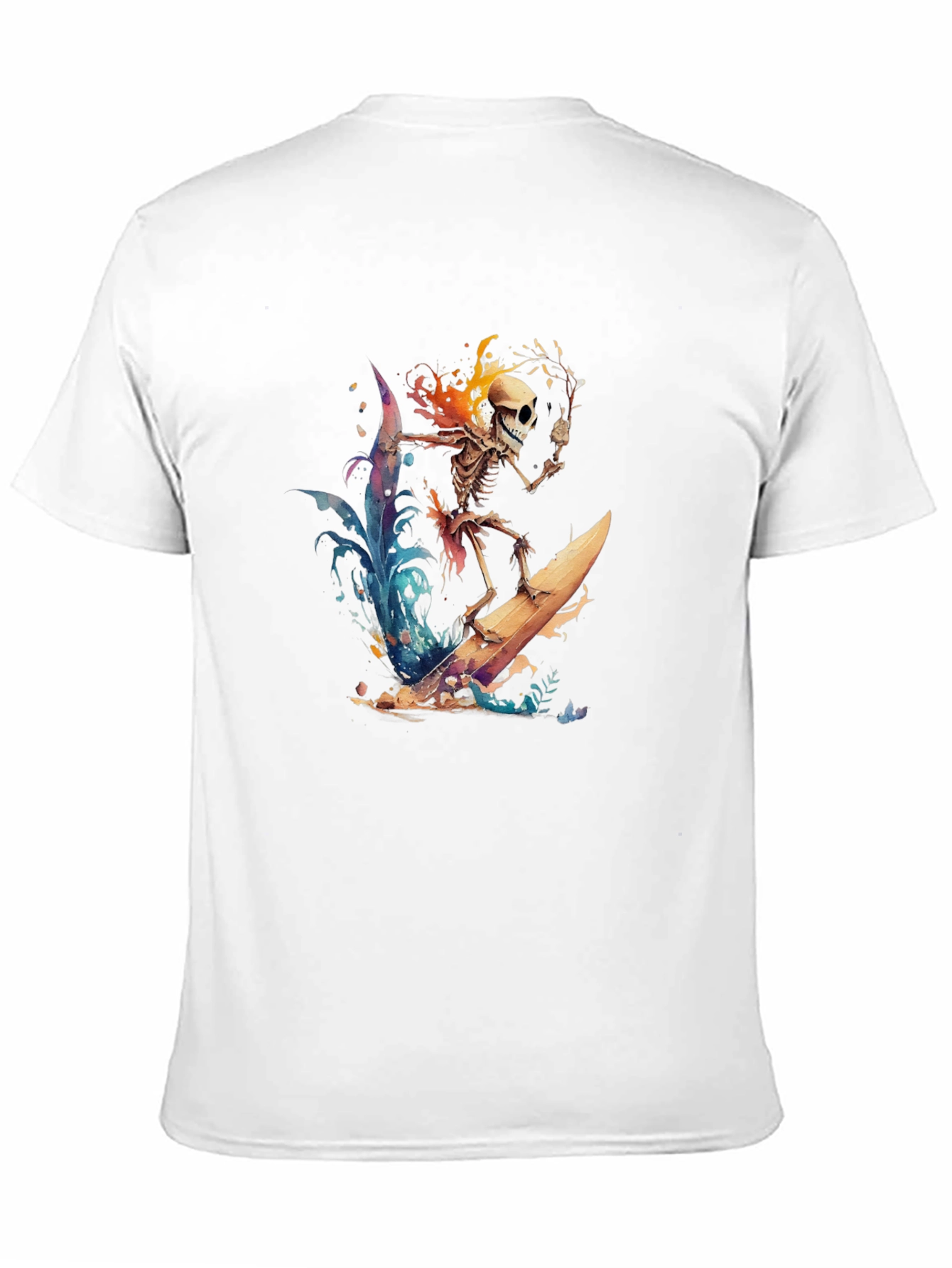 Ride the wave of style with this unique t-shirt featuring a skeleton surfer! The design showcases a detailed skeleton riding a surfboard amidst vibrant watercolor-style waves and flames. The dynamic and eye-catching graphic print makes this shirt a standout piece. Made from comfortable, breathable fabric, this t-shirt is perfect for casual wear, beach outings, or as a statement piece in your wardrobe. Embrace the edgy yet artistic vibe with this skeleton surfing t-shirt – ideal for those who love surf culture and unique artwork.