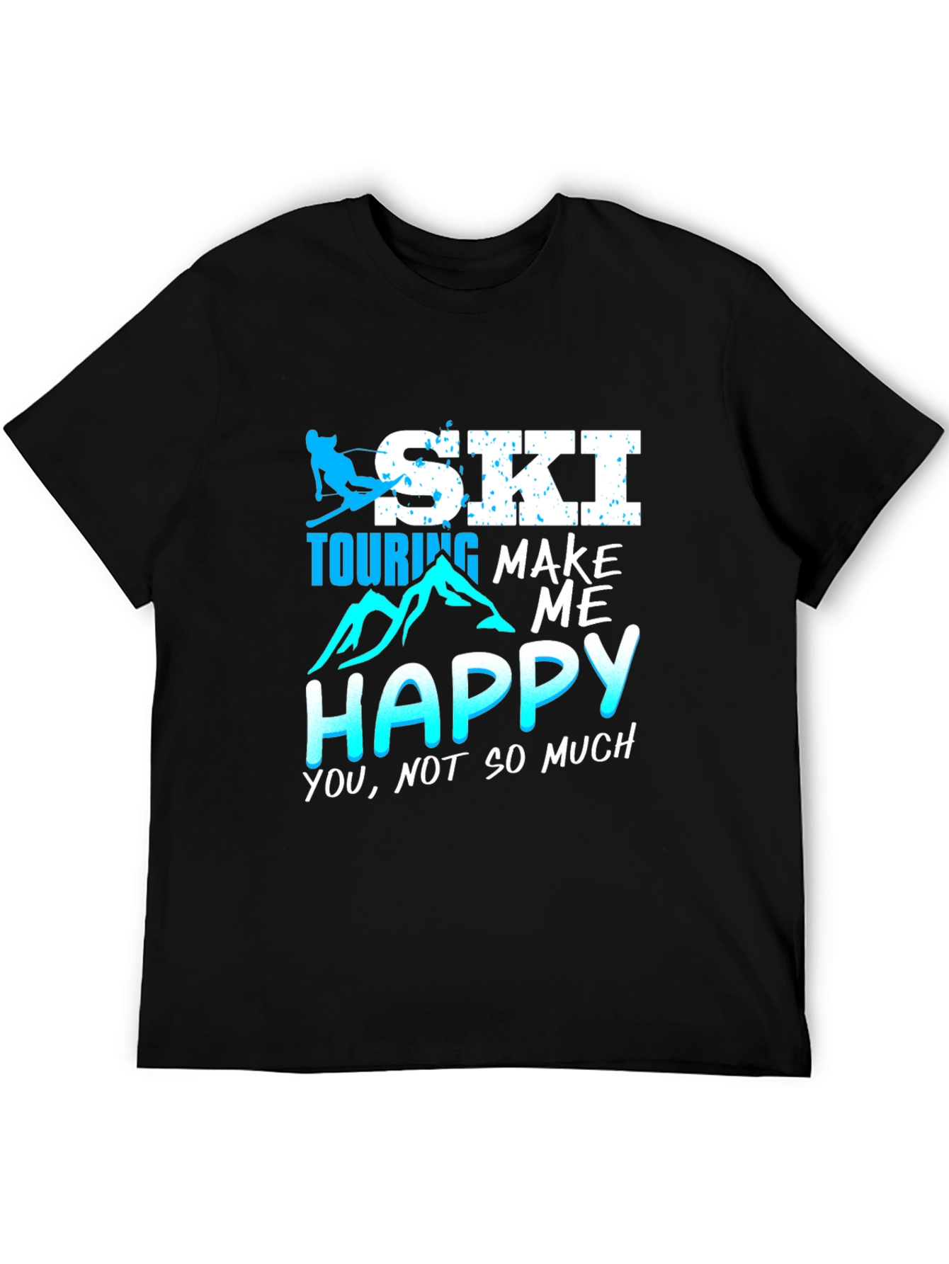 This black t-shirt features a playful design for ski touring enthusiasts. Bold white and blue lettering proudly declares, "SKI TOURING MAKE ME HAPPY, YOU, NOT SO MUCH," accompanied by a stylized graphic of mountains and a skier. The tee is likely made from comfortable cotton or a cotton blend, perfect for casual wear. Show off your passion for winter sports with this fun and unique shirt. Great for everyday wear, ski trips, or as a gift for the ski lover in your life.