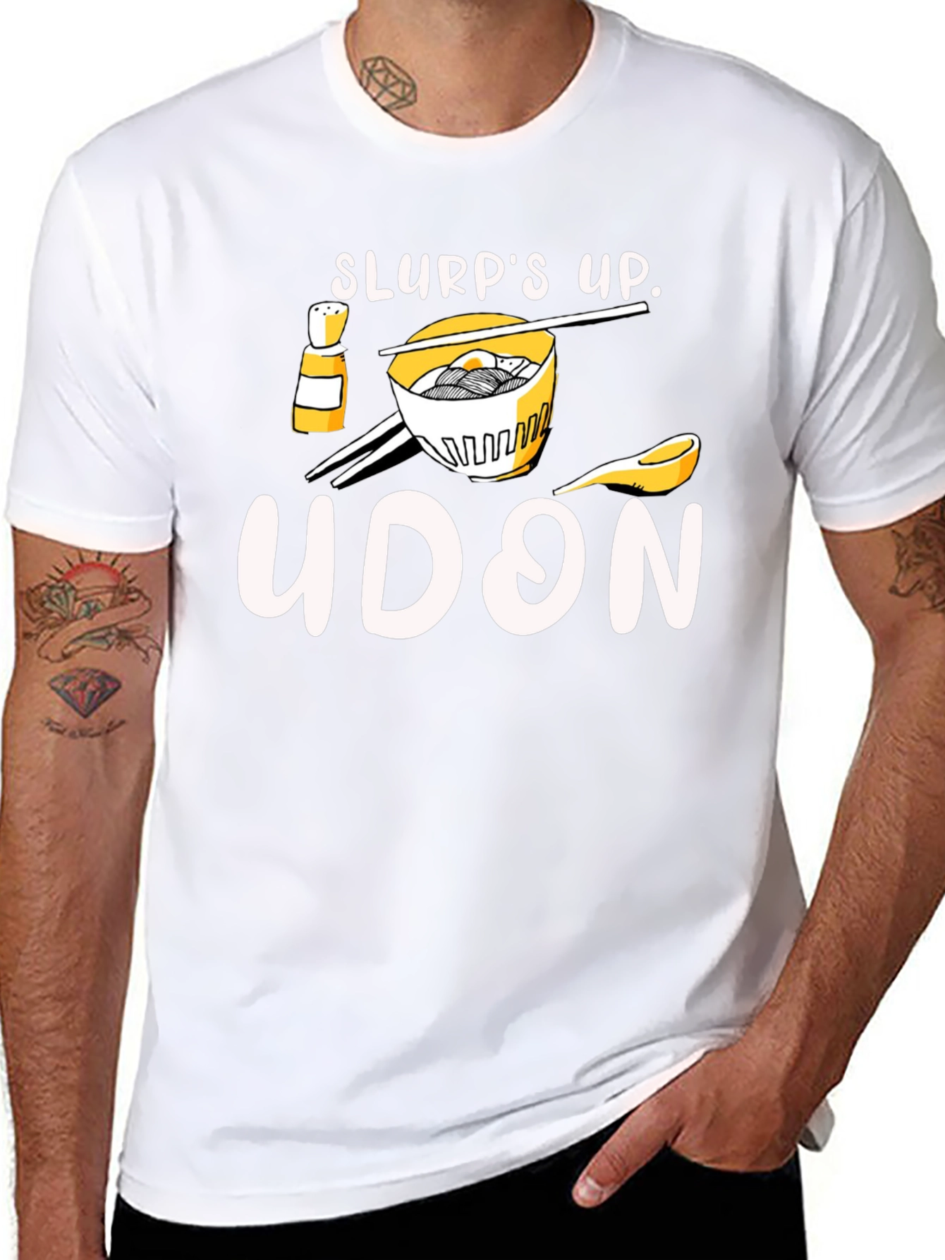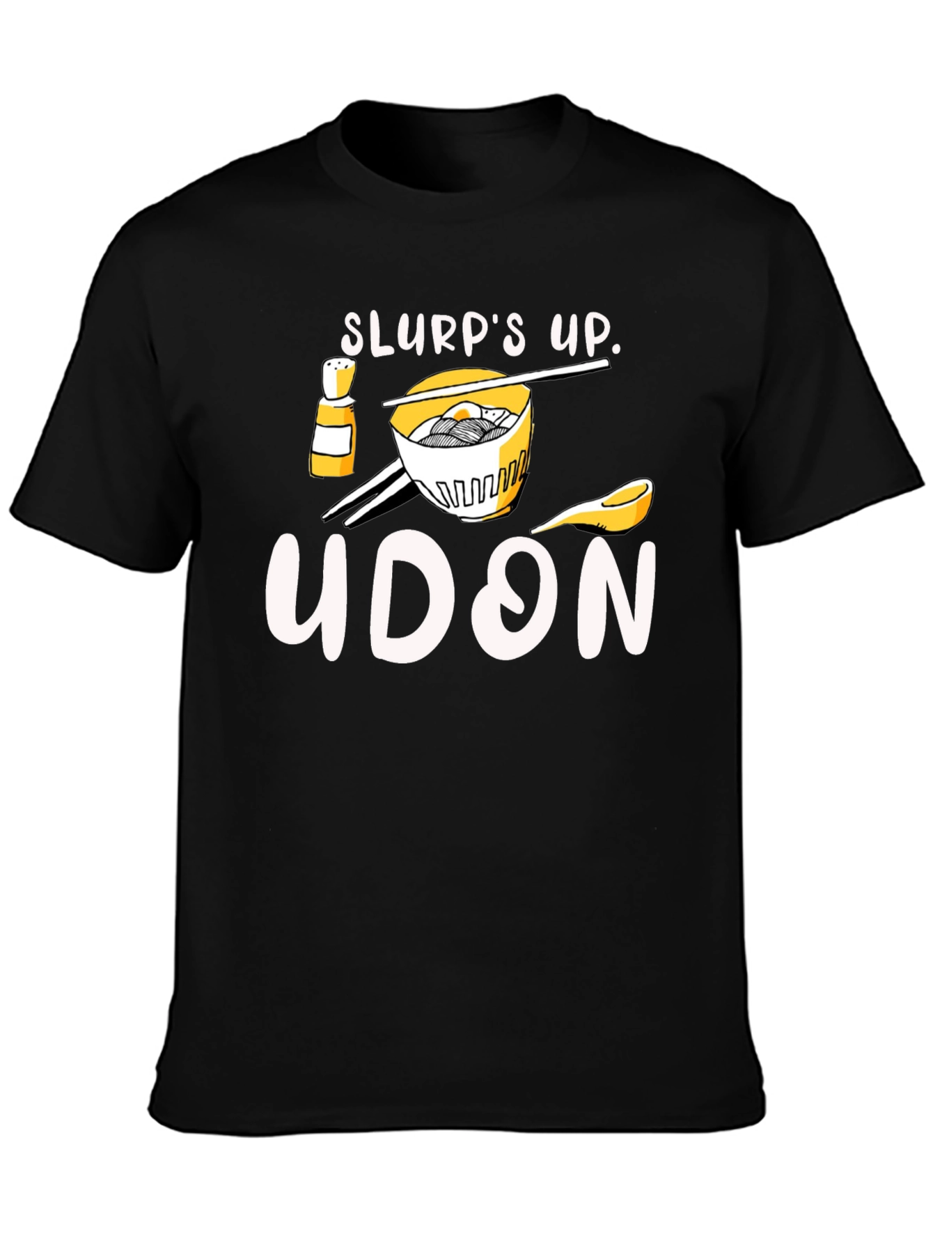 Indulge your love for Japanese cuisine with this playful 'Slurp's Up Udon' graphic t-shirt. The design features a charming illustration of a steaming bowl of udon noodles, complete with chopsticks, a spoon, and a shaker, all rendered in eye-catching yellow and white against a classic black background. Made from a comfortable and breathable fabric, this shirt is perfect for casual wear. Whether you're a foodie, a ramen enthusiast, or simply appreciate quirky designs, this t-shirt is a must-have addition to your wardrobe. Show off your unique style and love for all things udon!