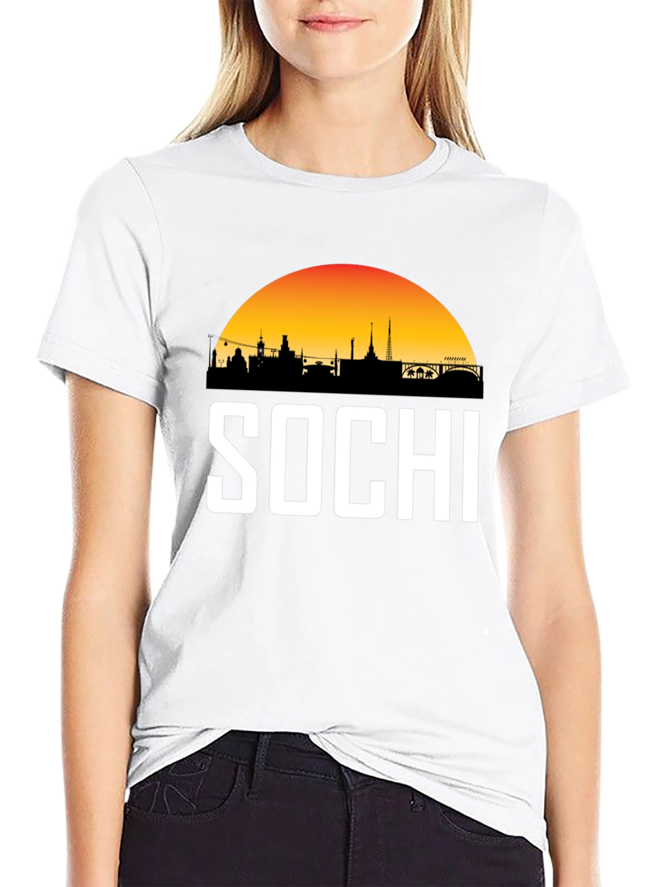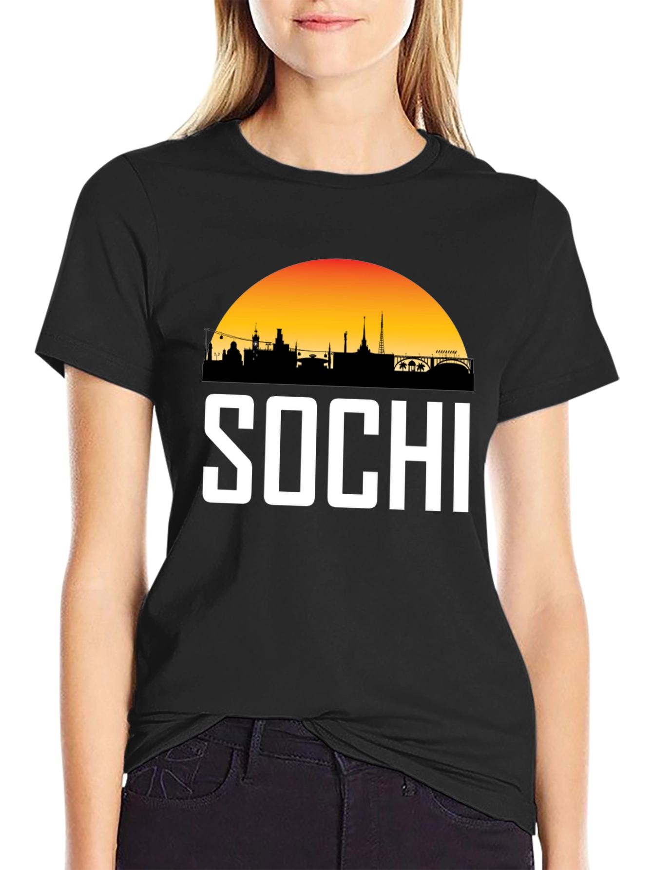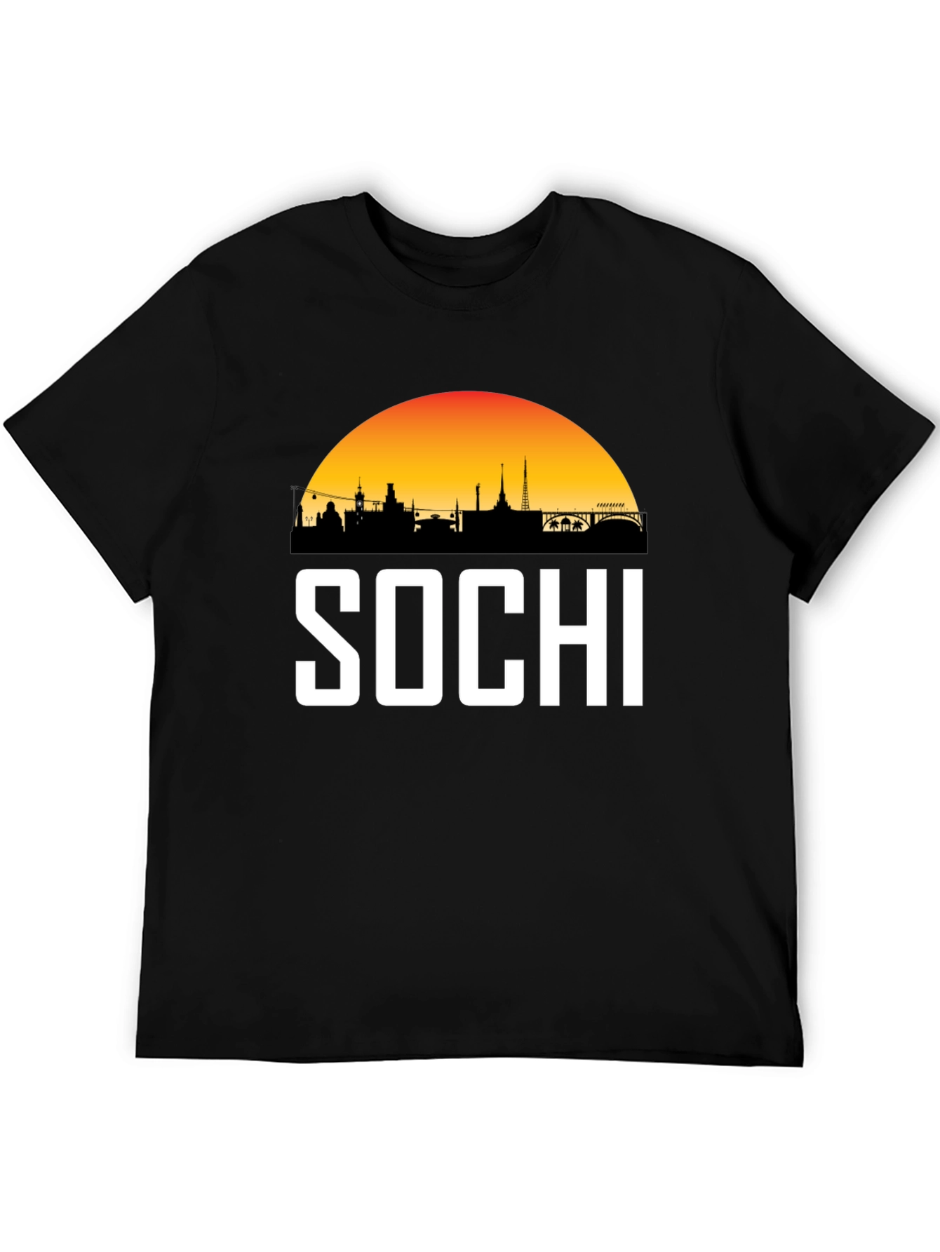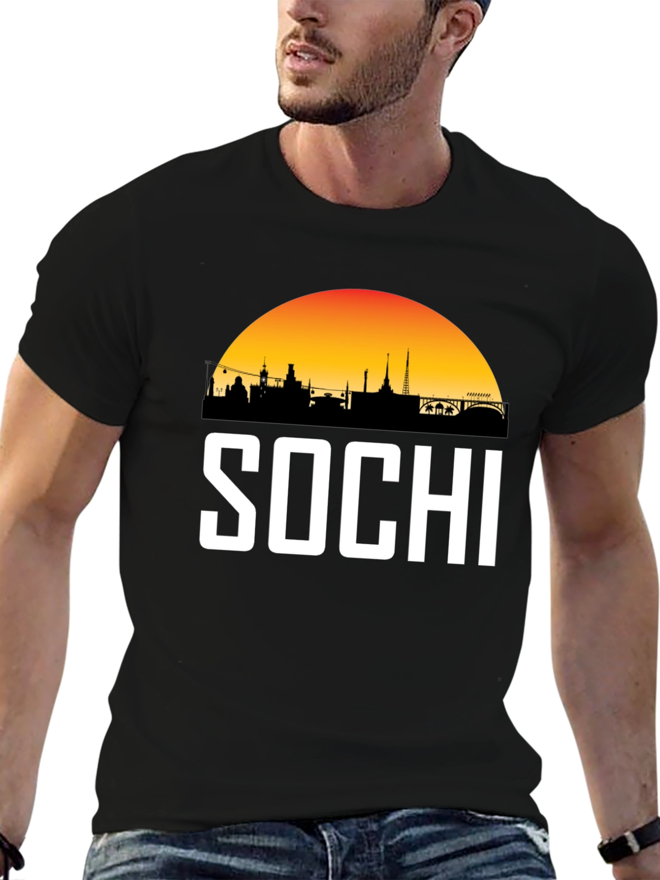 Show your love for Sochi with this stylish black t-shirt! The tee features a striking graphic print of the Sochi skyline silhouetted against a vibrant sunset. Made from a comfortable, breathable fabric, this shirt is perfect for everyday wear. The design includes the city name "SOCHI" in bold, white lettering across the chest. Wear it to the gym, out with friends, or while exploring the city. A perfect addition to any wardrobe and a great conversation starter.