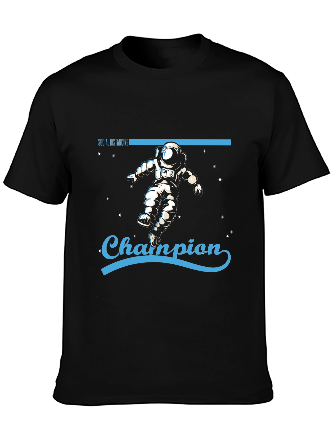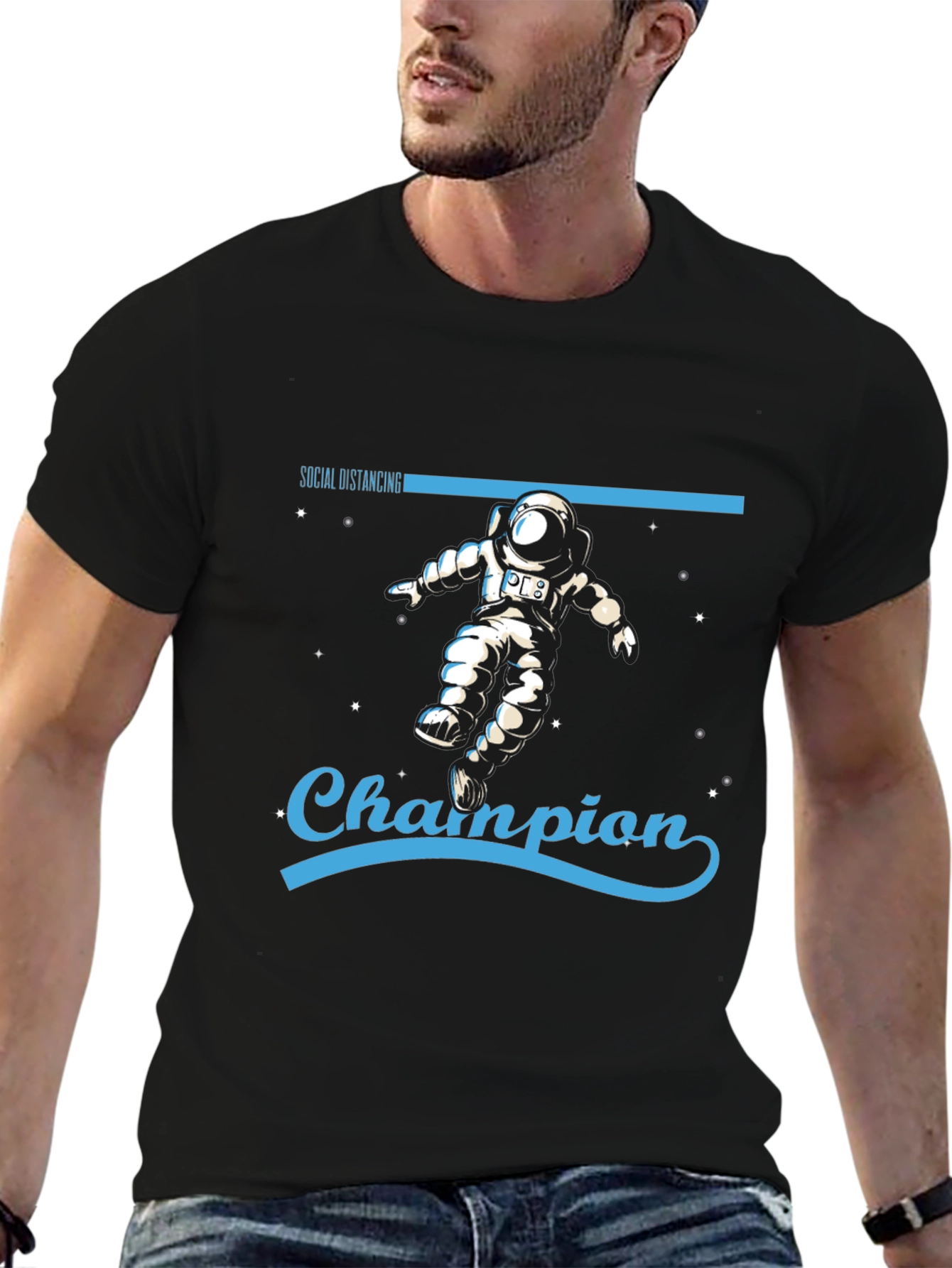 This black t-shirt features a unique and eye-catching design perfect for expressing your personality. The graphic showcases an astronaut with the playful slogan "Social Distancing Champion", making it a fun and topical piece. Made from a comfortable-looking material, this shirt is ideal for everyday wear. The design incorporates stars and a cool font, adding to its stylish appeal. Wear it casually with jeans or shorts, or dress it up with a jacket for a more polished look. Show off your sense of humor and stay comfortable with this awesome t-shirt!