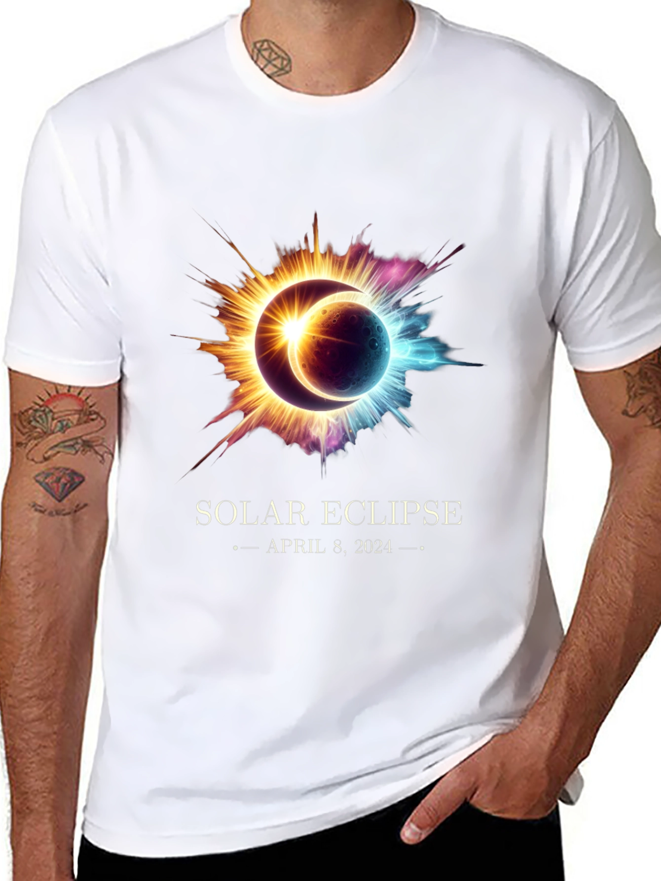 Celebrate the upcoming solar eclipse with this stylish and unique t-shirt! Featuring a striking design of the celestial event, this black tee is perfect for astronomy enthusiasts and eclipse chasers. The eye-catching graphic includes a vibrant depiction of the sun and moon during the eclipse, creating a bold and memorable statement. Marked with "April 8, 2024", this shirt is perfect for remembering the date. Made from comfortable materials, it's ideal for everyday wear or for your eclipse viewing party. Get yours now and be ready for the big day!