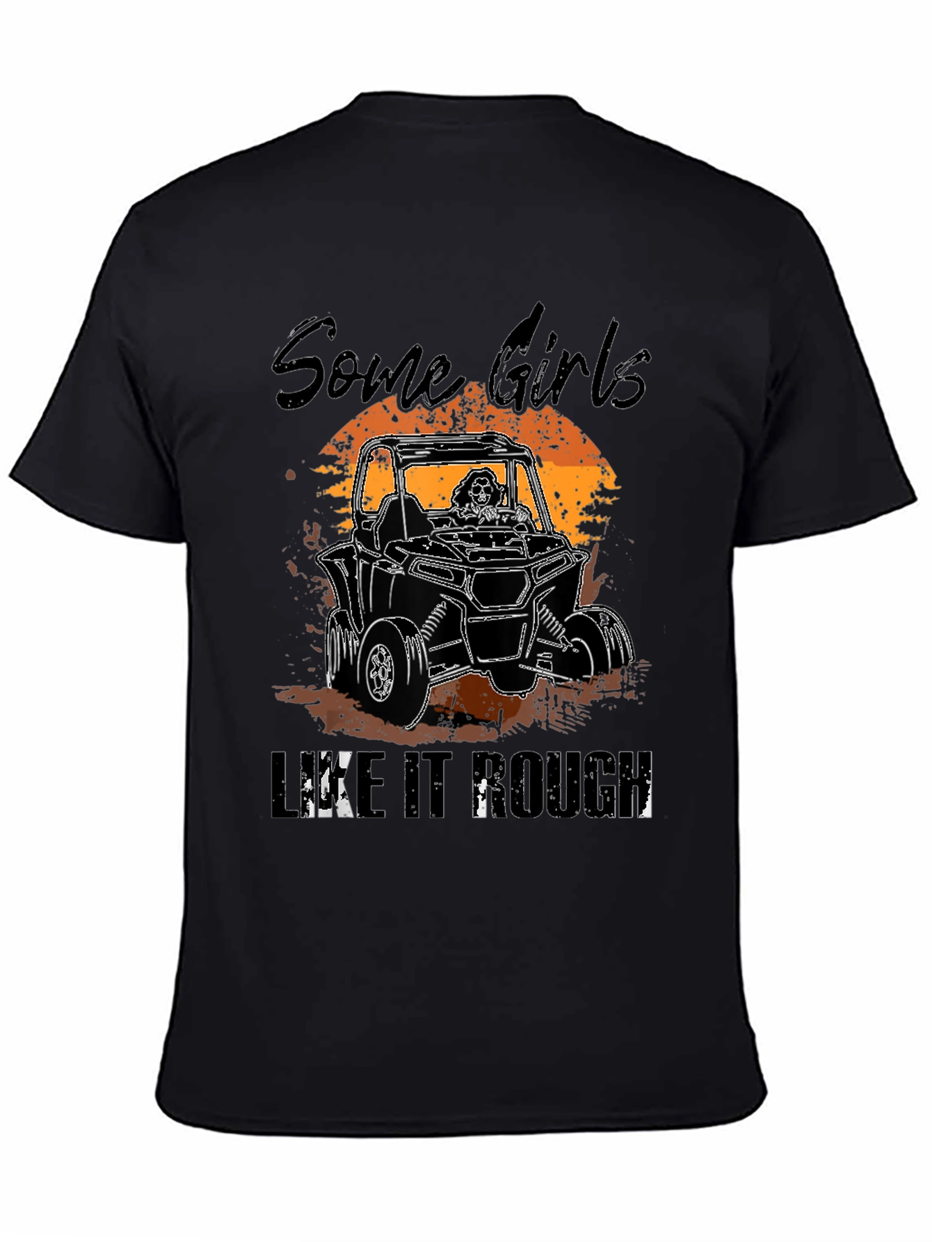 Show off your wild side with this unique black t-shirt! The design features the words "Some Girls" above a rough-and-tumble all-terrain vehicle illustration, complete with a sunset backdrop. The phrase "LIKE IT ROUGH" is printed below the ATV. This t-shirt is perfect for women who love outdoor adventures and aren't afraid to get a little dirty. It is ideal for casual wear, outdoor events, or simply expressing your adventurous personality. Made from comfortable materials, it's durable enough to withstand any escapade. Grab yours today and make a statement wherever you go!