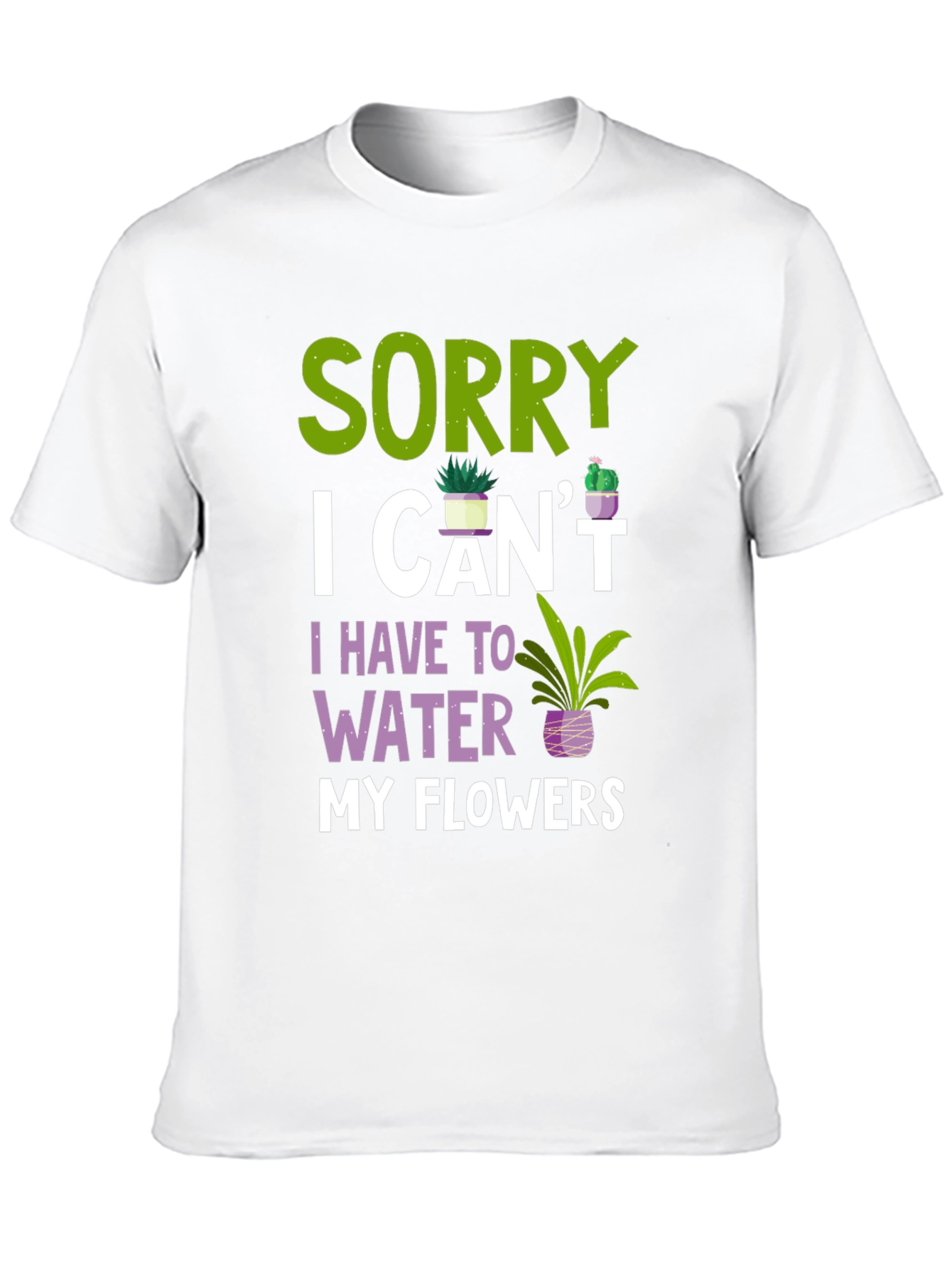This black t-shirt features a humorous and relatable graphic design, perfect for plant lovers. The witty statement "Sorry I Can't I Have To Water My Flowers" is displayed in a mix of green, white, and purple lettering, complemented by charming illustrations of potted plants. Made from a soft, comfortable fabric, this tee is ideal for casual wear, gardening days, or making a statement at social gatherings. Show off your love for your leafy friends with this fun and stylish t-shirt!