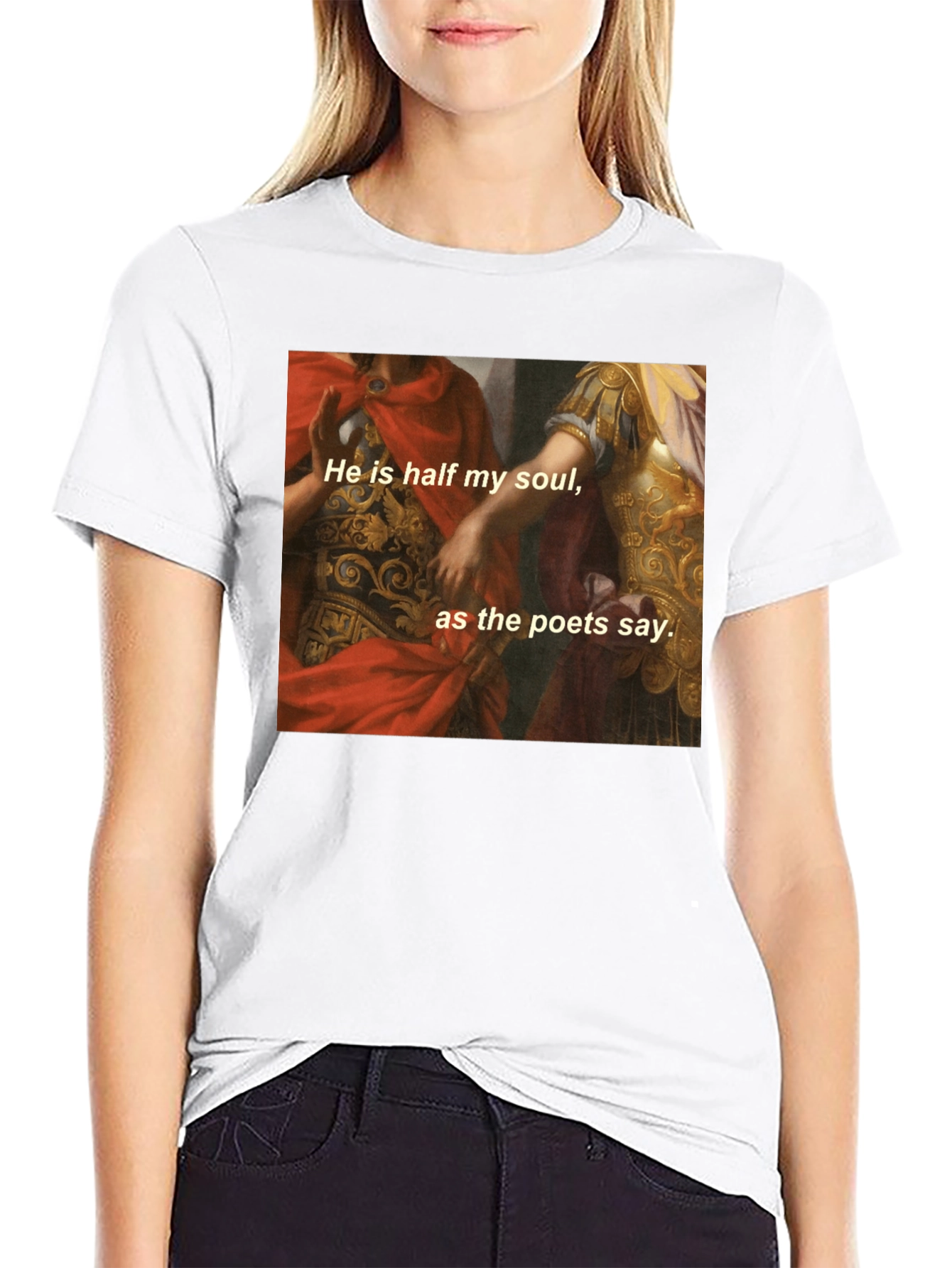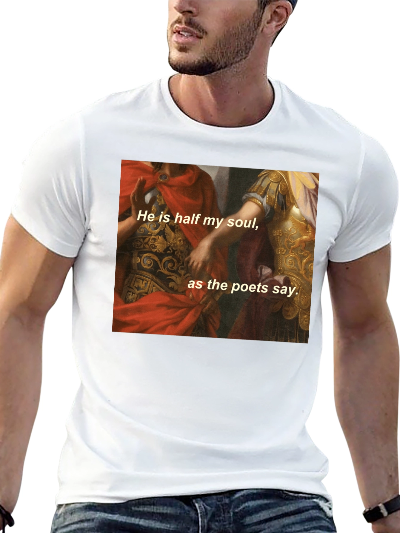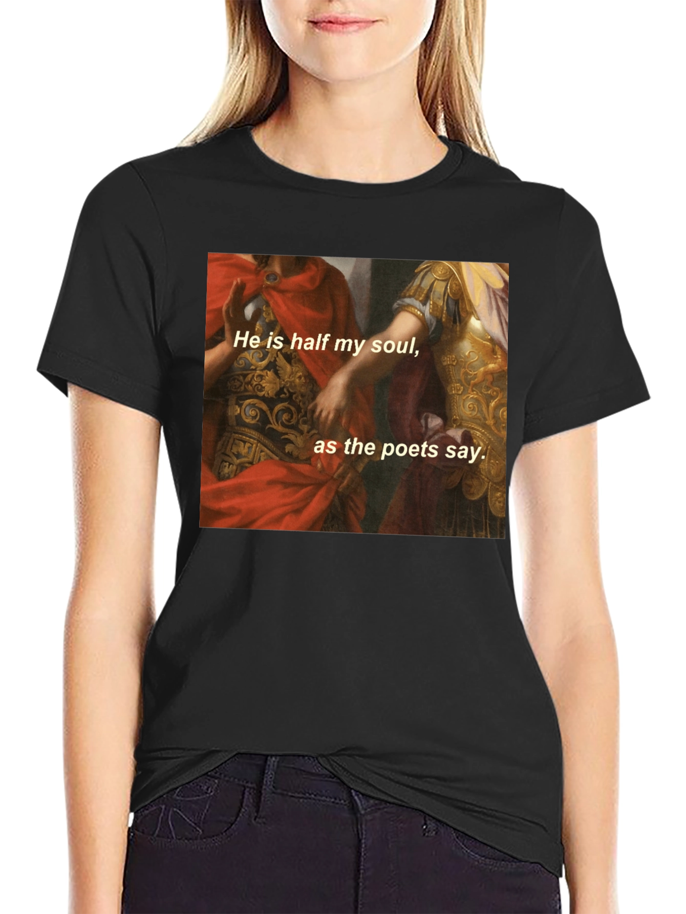 This stylish black t-shirt features a unique graphic design with the quote, "He is half my soul, as the poets say" layered over a classic art image. The short-sleeved tee is made from what appears to be a soft and comfortable fabric. Perfect for casual wear, this t-shirt makes a statement and shows off your appreciation for art, literature, and romance. Pair it with jeans, shorts, or dress it up with a blazer for a trendy look. Makes a great gift for anyone who loves classic aesthetics and thoughtful messages. Enjoy the comfortable fit and eye-catching design of this one-of-a-kind t-shirt.