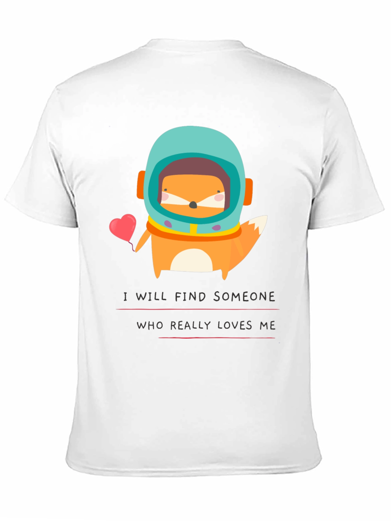 Express your personality with this unique graphic t-shirt! This black tee features a whimsical design of an orange fox wearing a space helmet, holding a heart-shaped balloon, and the text "I WILL FIND SOMEONE WHO REALLY LOVES ME". Made from what appears to be soft and comfortable cotton blend, this shirt is perfect for everyday wear, casual outings, or as a thoughtful gift for someone who loves quirky and expressive apparel. The vibrant colors and eye-catching design will make you stand out from the crowd, while the classic fit ensures a comfortable and flattering look. Add this playful and inspiring t-shirt to your wardrobe today!