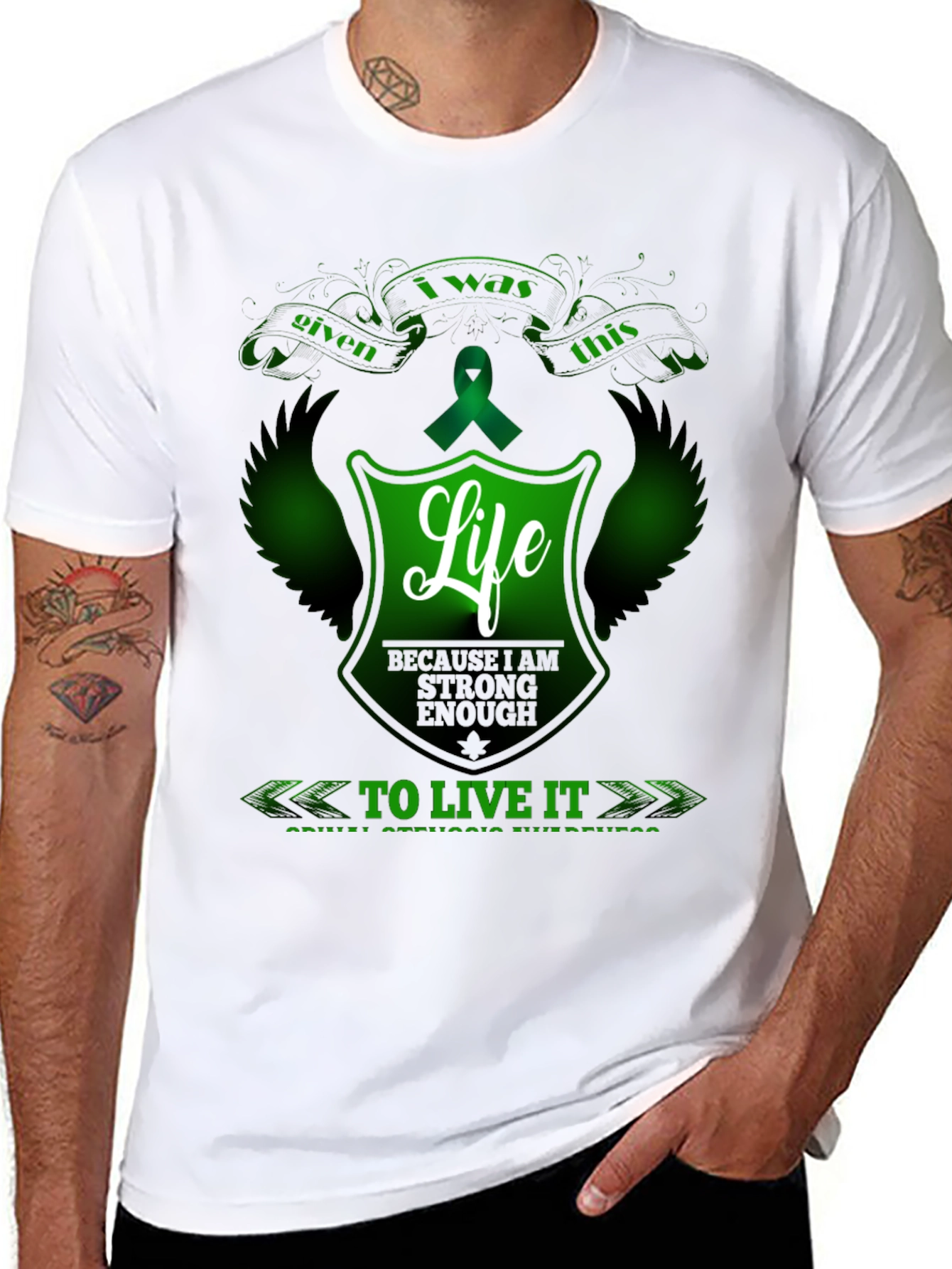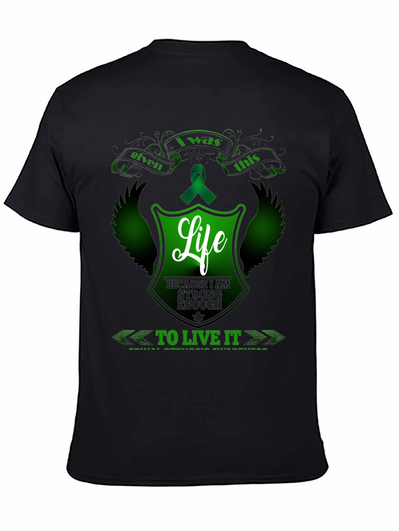 Show your support with this Spinal Stenosis Awareness T-shirt. This black tee features a green and white graphic with wings and the slogan 'Given this Life Because I am Strong Enough To Live It'. A green awareness ribbon is included in the design, which promotes spinal stenosis awareness. Made from comfortable fabric, this T-shirt is perfect for everyday wear, awareness walks, or showing support for loved ones. Let's raise awareness and spread hope. The unique and poignant design makes it a great gift for people affected by spinal stenosis.