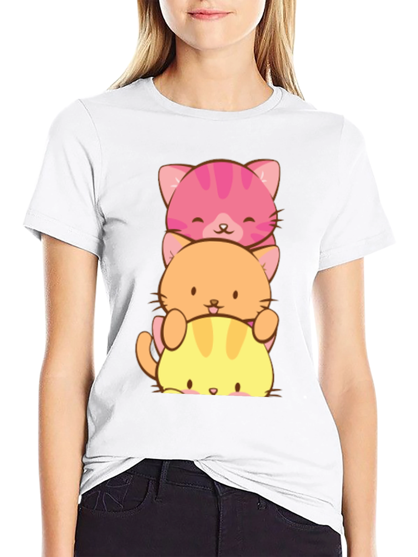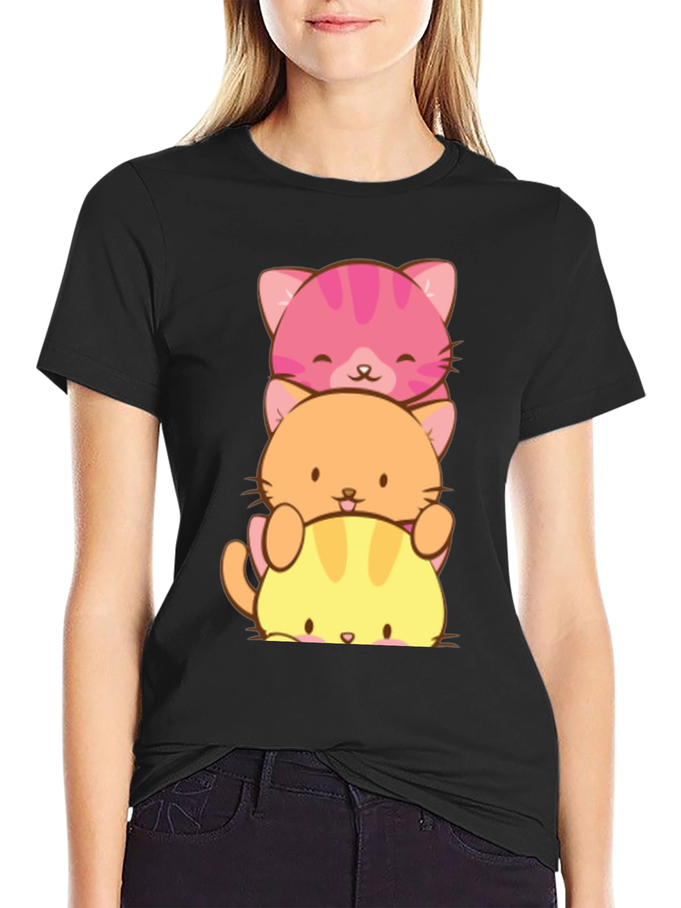 Show off your love for cats with this adorable black t-shirt! Featuring a stacked design of three cute, kawaii-style cartoon cats in pink, orange, and yellow, this tee is sure to bring a smile to your face. Made from a comfortable-looking fabric, this shirt appears soft and breathable, perfect for everyday wear. The vibrant colors of the cats really pop against the black background, making it a fun and eye-catching addition to any wardrobe. Wear it casually with jeans, or dress it up with a skirt. It's a purr-fect gift for any cat lover!
