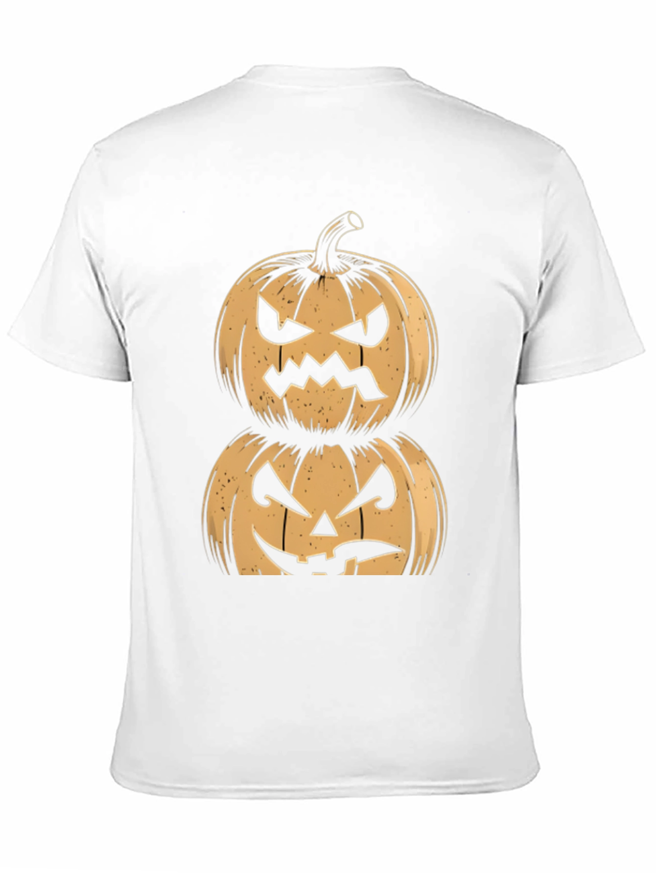 Get ready for Halloween with this eye-catching black t-shirt featuring a unique design of two stacked pumpkins! The pumpkins are illustrated in a vintage style with scary, cartoonish expressions and carved faces. The t-shirt is made from a comfortable-looking, breathable fabric, ideal for casual wear during the spooky season. The dark color provides a striking backdrop for the detailed pumpkin graphics, making the design pop. Wear it to Halloween parties, trick-or-treating, or as a fun everyday outfit to celebrate the holiday! Perfect for those who love pumpkins and Halloween.